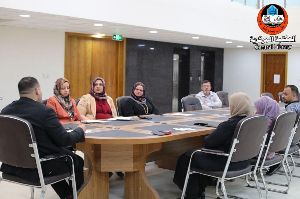 In light of Rector Alahmady’s directives towards improving library services and facilitating library users’ access to them, the Secretary General of the University of Mosul Libraries, Mr. Sayf Al-Ashqar, chaired a meeting with the heads of the library divisions and non-division units to discuss the administrative and technical work progress of the Central Library, its plans and programs, the difficulties it faces and the ways to deal with them.