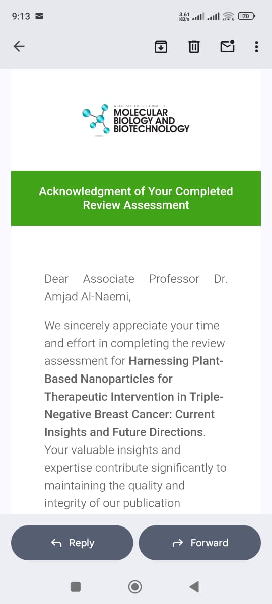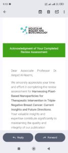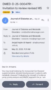 As part of the outstanding academic efforts of the faculty members at the University of Mosul, Dr. Amjad Hazem Al-Nuaimi, a lecturer in the Department of Biochemistry at the College of Medicine, has reviewed over ten scientific research papers for reputable journals indexed in Scopus during the academic year 2024-2025. These journals include the Journal of Diabetes and Metabolic Disorders and the Asian Pacific Journal of Molecular Biology and Biotechnology, among others. This reflects the university’s commitment to enhancing scientific research and elevating the academic level.
