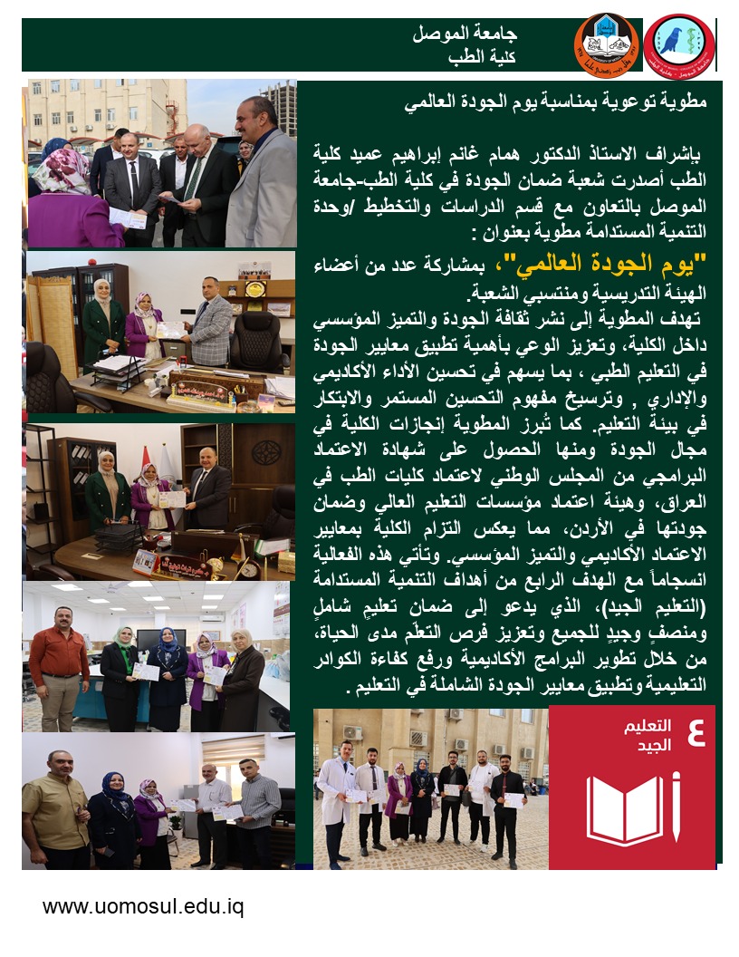 yasirtalal2025-11-16T21:15:53+00:00*Awareness Brochure on the Occasion of World Quality Day Under the Supervision of Prof. Dr. Humam Ghanim Ibraahim, Dean of the College of Medicine* The Quality Assurance Division at the College of Medicine, University of Mosul, in collaboration with the Studies and Planning Department-Sustainable Development Unit, issued a brochure titled "World Quality Day", with the participation of several faculty members and staff of the division. The brochure aims to spread the culture of quality and institutional excellence within the college, and to raise awareness of the importance of applying quality standards in medical education, which contributes to improving academic and administrative [Read More]
