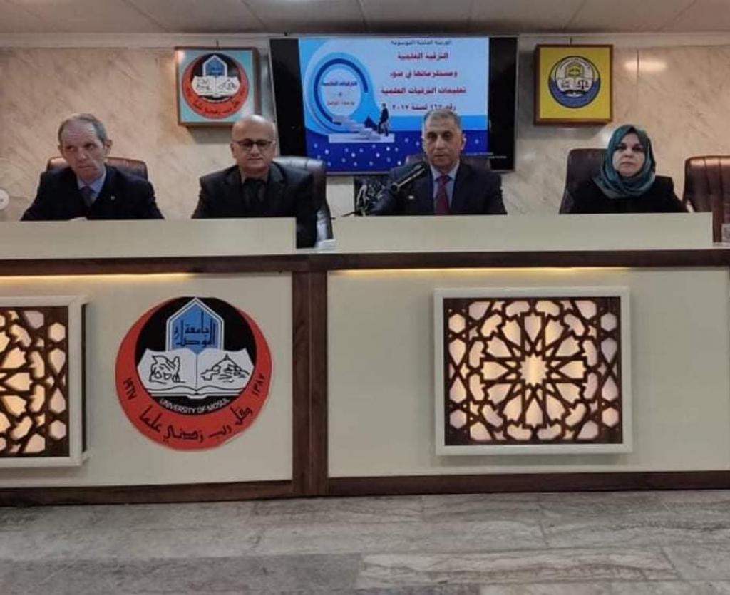 Under the patronage of the President of University of Mosul, Prof Dr Qusay K. Al-Ahmadi, and under the supervision of the Deanship of the College of Law, the scientific workshop entitled “Scientific promotion and its requirements in light of the instructions for scientific promotion No. 167 of 2017” was held on Monday 20th December 2021. The workshop was attended by a number of university teaching staff among them, the chairman and his deputy of the Scientific Promotions Committee of the College of Medicine, Prof Dr Ali A. Muhammad (from the Department of Surgery), and Assistant Prof Dr Maysoon M. Al-Qazzaz (from the Anatomy Department).