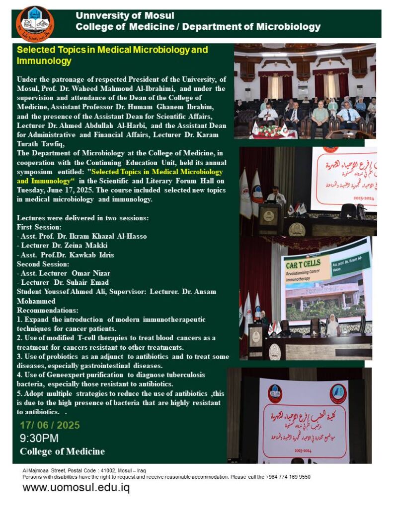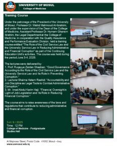 Under the patronage of the President of Mosul University, Professor Dr. Waheed Mahmoud Al-Ibrahimi, and the supervision of the Dean of the College of Medicine, Assistant Professor Dr. Humam Ghanim Ibraahim, the Legal Department at the College of Medicine, in collaboration with the Quality Assurance and Performance Evaluation Department, within the activities of the Continuing Education Unit, organized a training course titled “The Role of Civil Service Law and University Service Law in Reducing Administrative and Financial Corruption” during the period 3-4/6/2025.