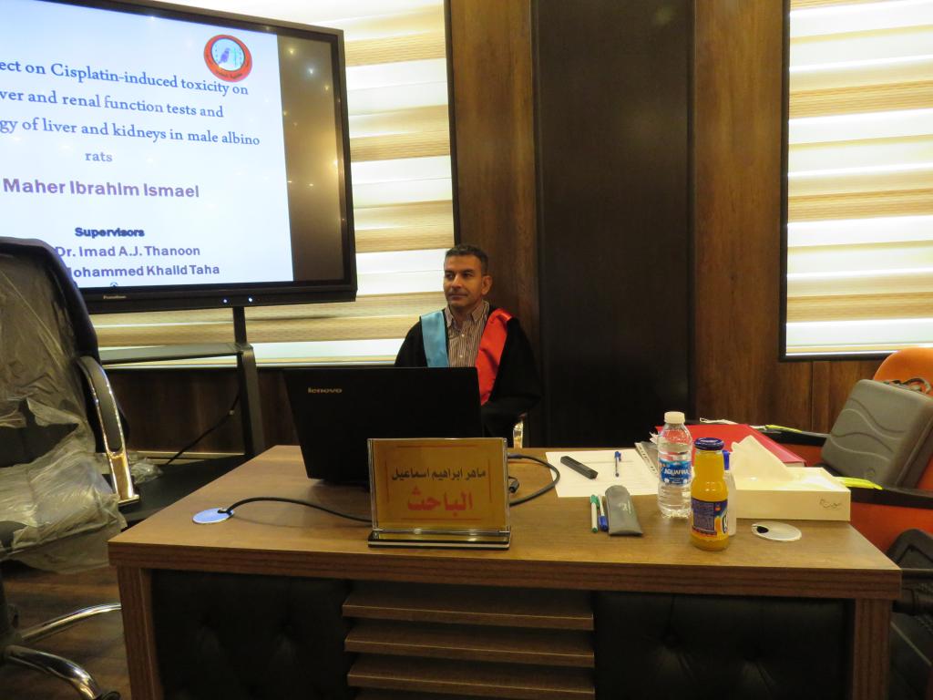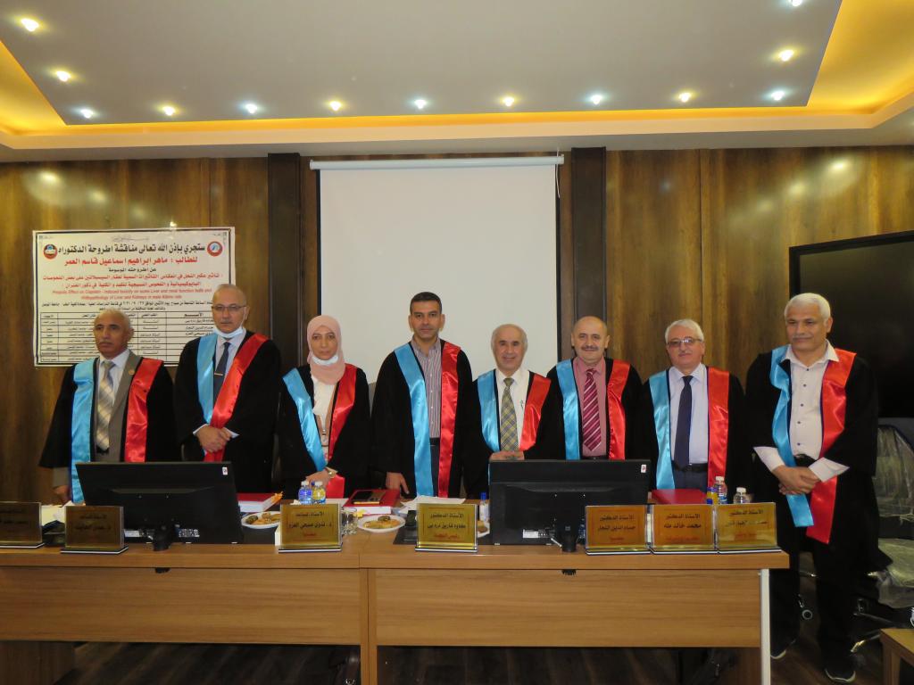 The College of Medicine, University of Mosul, discussed the doctoral thesis of the Department of Pharmacology entitled “ Propolis Effect in the reflection on Cisplatin: Induced Toxcicity on some Liver and Renal Function Tests and Histopathology of Liver and Kidneys in Male Albino Rats” presented by the student Maher I. Al-Omar on Monday, 27th September 2021.