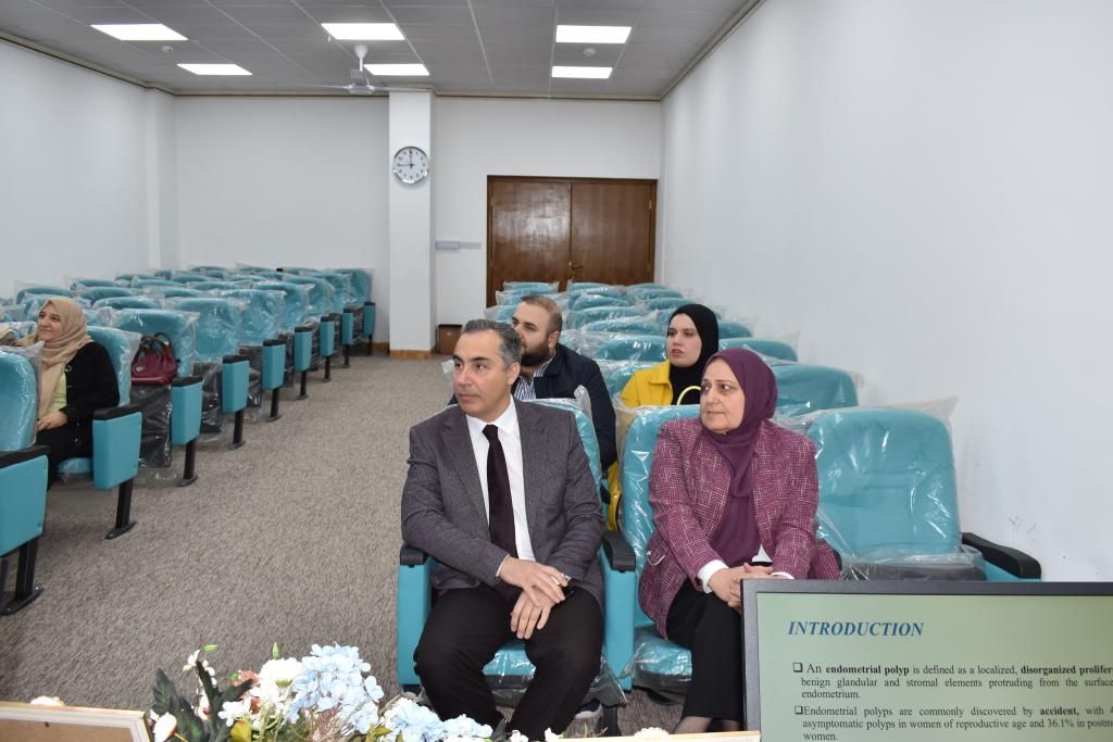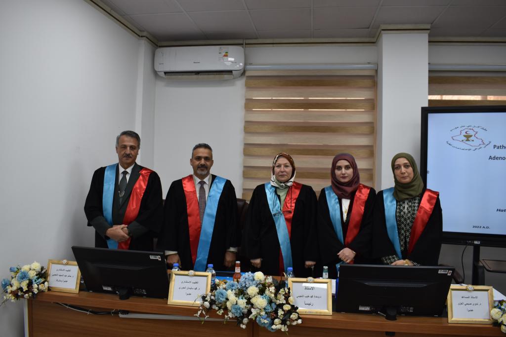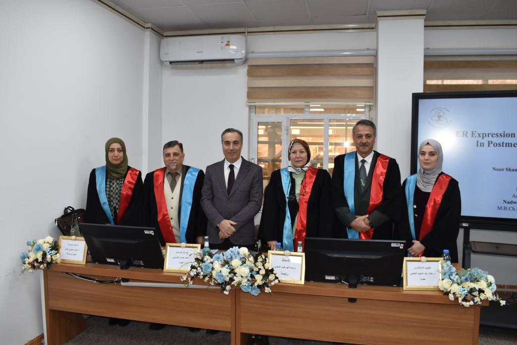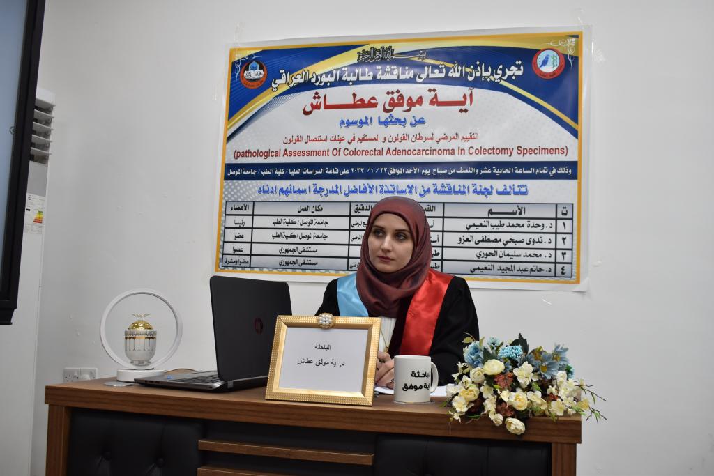 It was discussed two Iraqi Board students on Sunday, 22 / 1/ 2023 in histopathology in the auditorium of higher studies in the building of deanship.The Dean of the College of Medicine, Prof Dr Basil Mohammednathir Saeed opened the first discussion in the subject of “Estrogen receptors in uterine tumours” for the student Noor Sh. Mohammed Salih. Prof Dr – the Head of the Committee – Wahda Muhammad Tayeb read the administrative order for the discussions. The first committee consisted of Assistant Prof Dr Ahmed J. Al-Hassani and the consultant physician, D Hatem A. Al-Nuaimi. The thesis was supervised by Prof Dr Nadwa Al-Azzo.It was followed by a discussion of the second thesis entitled “pathological evaluation of colorectal cancer” by the student Aya M. Attash, whose discussion committee was chaired by Prof Dr Wahda Muhammad Tayeb. The committee consisted of the consultant doctor, Muhammad S. Al-Houri, and Prof Dr Nadwa Al-Azzo. The research was supervised by the consultant doctor, Hatem A. Al-Nuaimi.The two discussions were characterized by a calm and useful scientific atmosphere. The Dean and Scientific Vice- Dean, Prof Dr Humam Gh. Zubeer attended one side of both discussions. The efforts of the supervisors and the two students were crowned with success, and their papers were accepted by the members of the committee. Wish students lasting success.