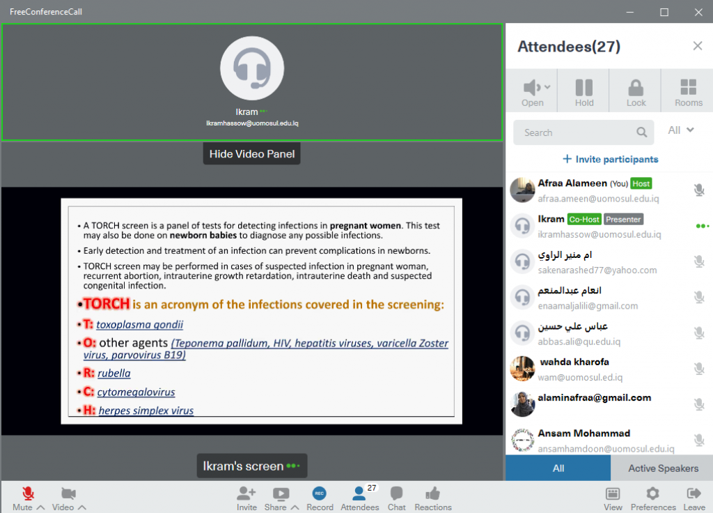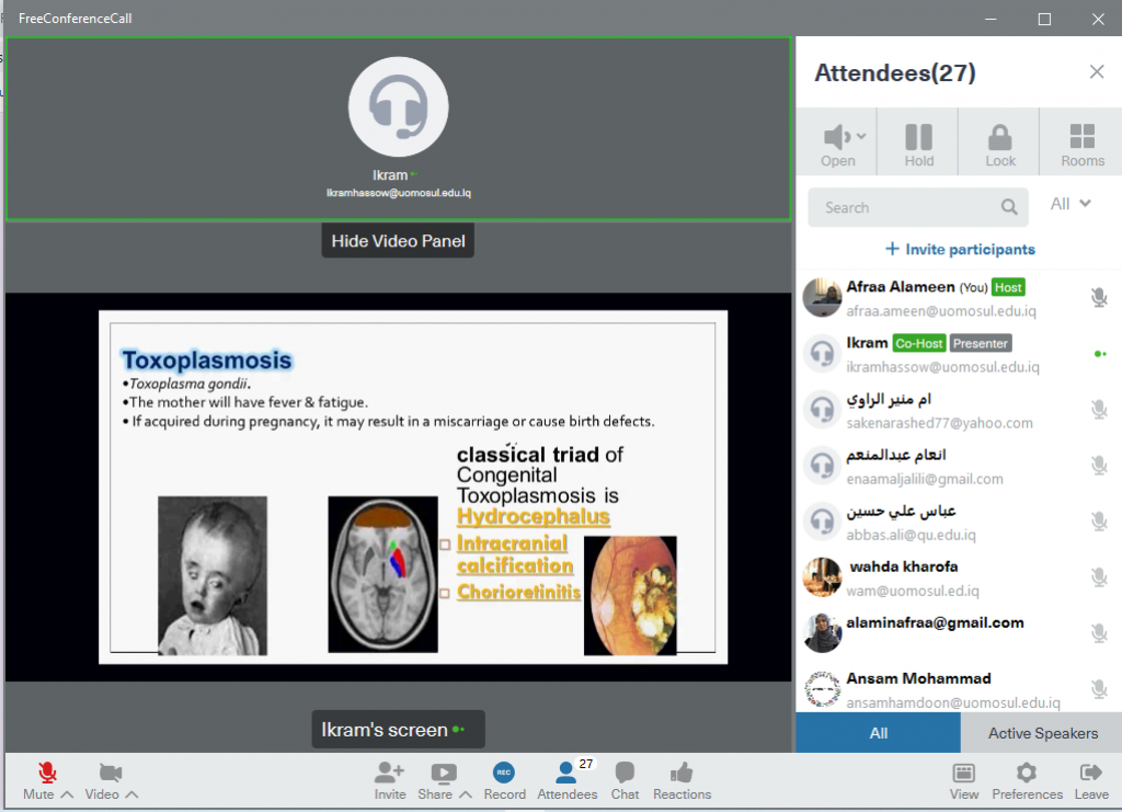 Under the patronage of the Dean of the College of Medicine, Prof Dr Basil Mohammednather Saeed, the College of Medicine held a virtual training course, as part of the continuing Learning activities entitled “Medical Screening Tests of Healthy People” for three days, from 29th March. In which the professors from the Departments of Medical Physiology, Biochemistry and Microbiology delivered their lectures.On the first day, the Head of the Medical Physiology Department, the Assistant Prof Dr Afra’ M. Al-Amin, delivered a lecture entitled “Introduction to Screening”Then delivered a lecture by Lecturer Dr Maryam H. Abdel-Jalal from the Department of Biochemistry entitled “Indicators of Tumours”In the second day, the lecturer Dr Bushra K. Abdel Qader, from Medical Physiology department delivered her lecture entitled “The Role of Medical Physiology in Screening Tests.” Then the Lecturer Dr Ikram Kh. Qassim, from the Department of Microbiology, delivered his lecture entitled “TORCH Screening Tests”As for the third day’s lectures, it was for professors from the Department of Biochemistry. The Lecturer Dr Sura Kh. Mohi El-Din delivered a lecture entitled “Examples of some Biochemical Tests in the Screening Test”, followed by a lecture delivered by the Lecturer Saba Kh. Saleih entitled “Some Important Laboratory Screening Tests”The session came out with several recommendations, including:-The necessity of conducting periodic tests and considering it one of the important things to discover health problems and diseases that may be hidden and whose symptoms do not appear in the early stages especially for people who have a family history of the disease such as breast cancer.-Screening for obesity and high blood pressure.-The necessity of conducting a TORCH examination in the event of a suspected infection of a pregnant woman and repeated miscarriage as early detection of infection prevents complications in new-borns.