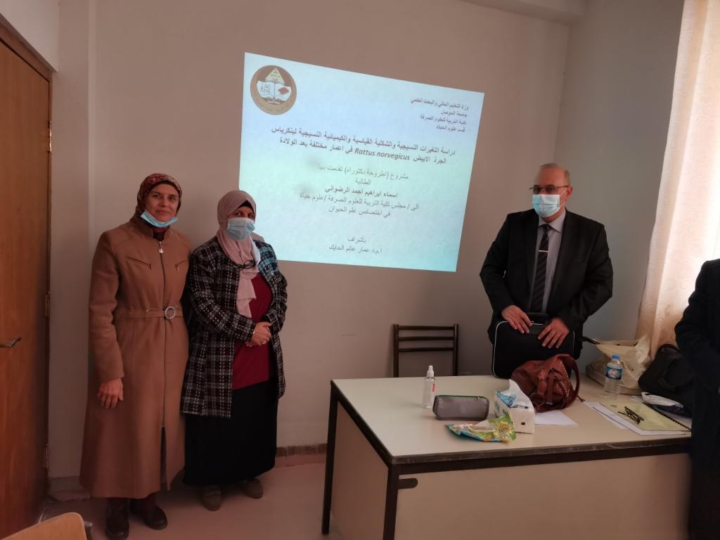 At the College of Education for Pure Sciences a doctoral thesis project presented by the student Asma I. Al-Radwani entitled “Study of the standard histopathological and morphological and histochemical changes of the white rat pancreas Rattus Norvegicus at different ages after birth” was discussed on Tuesday 15th December 2020. The discussion committee consisted of a number of professors including the Head of the Medical Biology Division, Department of Anatomy, Assistant Prof Dr Buthaina H. Hashim.