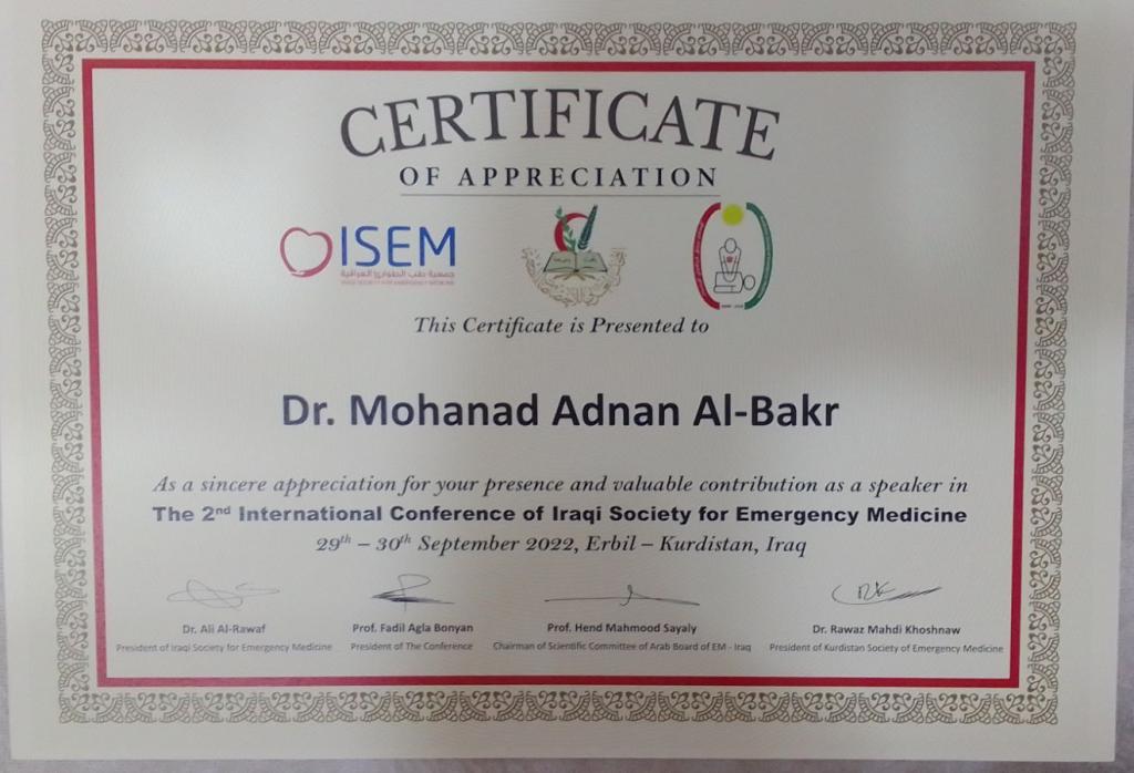 Participation of the teaching staff, Prof Dr Ali Abdel Muttalib and Lecturer Dr Muddathir A. Al-Taei and Lecturer Dr Muhannad Al-Nuaimi from the Department of Surgery, College of Medicine in the activities of the Second International Emergency and Accident Medicine Conference in Erbil for the period between 29th -30th September, which was supervised by the Iraqi, Kurdistan, Omani, Emirati and Qatari Society for Emergency Medicine and Accidents