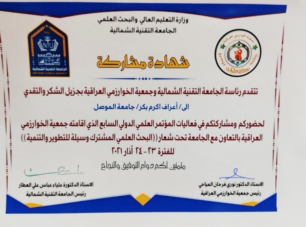 Under the auspices of the Presidency of the Northern Technical University, the Iraqi Al-Khwarizmi Association and the Mosul Technical Institute held the seventh international scientific conference “Joint scientific research is a means of development and development” for the period 23-24 March 2021. Dozens of academics and researchers from various Iraqi universities participated in the conference’s activities. Among them an official Technical Support Unit, Quality Assurance and Performance Assessment Division, College of Medicine, Assistant Lecturer, Araf A. Bakr for his research entitled “Deep Learning Models (LSTM) and (GRU) for Monaural Audio Source Separation Using Optimal Ratio Mask (OMR)” The number of submitted research papers reached 127 papers distributed on several items such as mathematics, statistics, physics, computers, life sciences, and others which it is hoped will be published later in international publishing containers. For more details, Click Here.