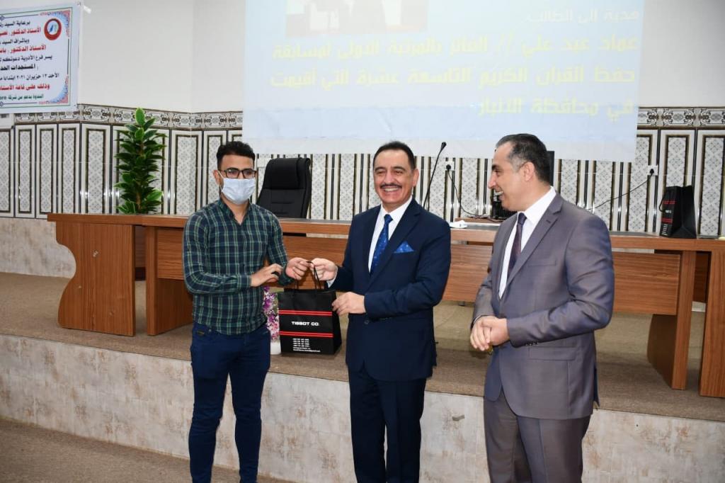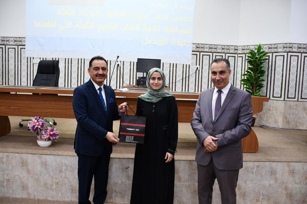 On the sidelines of the work, the Chairman of the Central Committee of the Noble Qur’an at University of Mosul, Assistant Prof Dr Abdul-Malik S. Muhammad, was honored with a letter of thanks and appreciation by the Deanship. A commendable gift was also presented to the student Imad A. Ali and the student Drasan M. Aziz (third stage) for obtaining two advanced results in two separate competitions for the Holy Quran in the field of memorization and recitation.