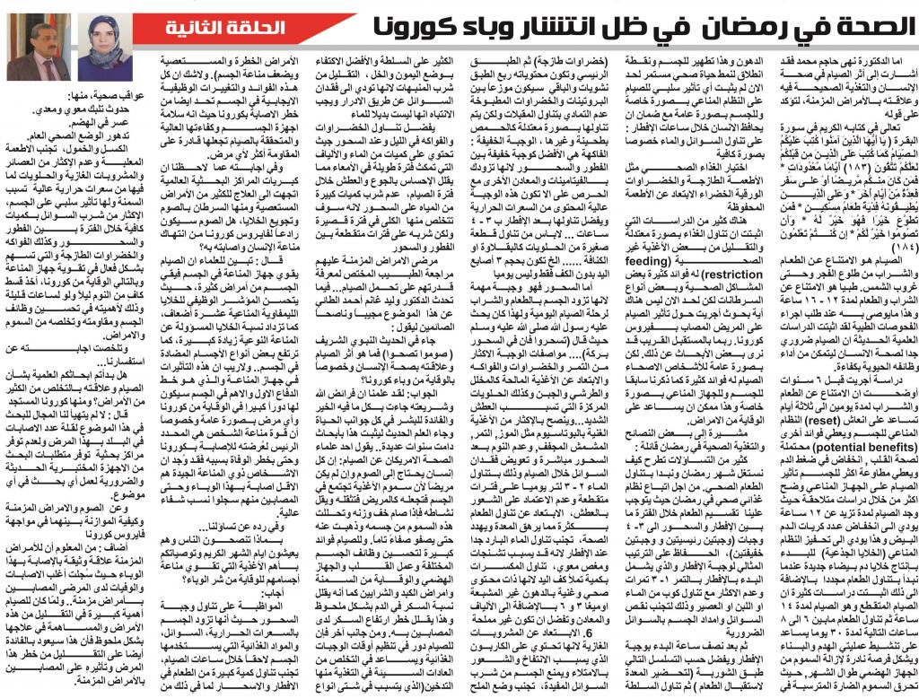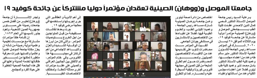 The 121st edition of the online edition of the newspaper of Wamadhat Jamia`a published by the University of Mosul, issued in 21st May 2020 with various scientific, social and cultural topics related to the university’s presidency, colleges, or research centers. Regarding the College of Medicine, the first page was highlighted on the joint scientific conference that the college held with its counterpart from Wuhan University, China on the Covid 19 pandemic, which was held on 28th April 2020. As for the third page, it included the second episode of the prolonged investigative report on health in Ramadan in light of the spread of the Corona epidemic, where the Head of the Department of Family and Community Medicine was hosted by associate Prof. Dr Walid Gh. Ahmed Al-Ta’i, and the lecturer of the same Department Dr Noha H. al-Assaf. While the seventh page presented news about a workshop held by the Department of Student Activities (on April 22, 2020), in which the head of the Department of Microbiology , the lecturer Dr Firas M. al-Taie, presented his lecture entitled “The immune system and the normal body function in defense against diseases” It is mentioned in this regard that the Wamadhat Jamia`a newspaper issued by the University of Mosul by the Department of Information and Public Relations has been re-issued online and weekly.