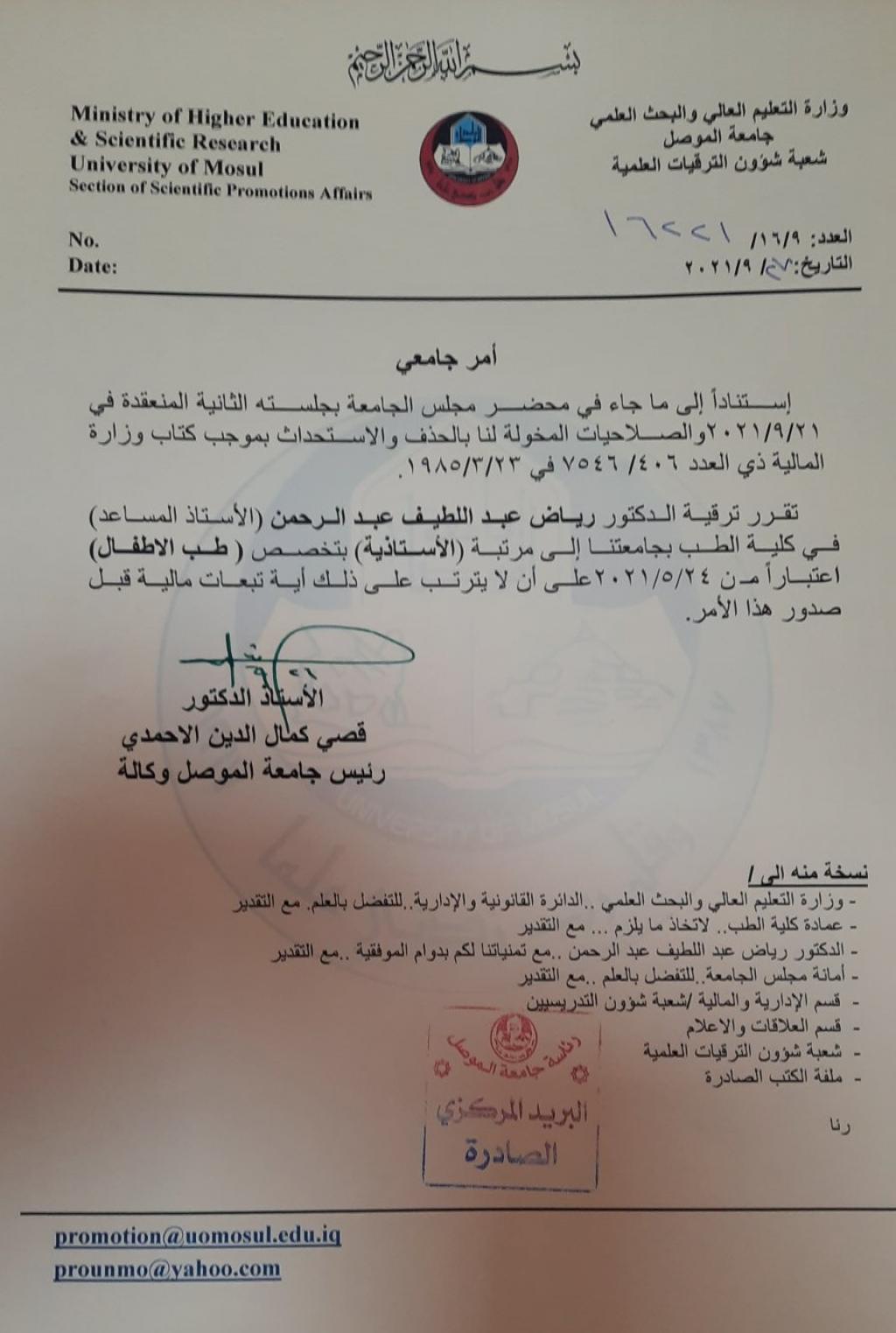 The Deanship of the College of Medicine Congratulates the Head of the Paediatrics Doctor Riyadh Abdullatif Al-Obaidi for His Promotion to the Rank of Professor