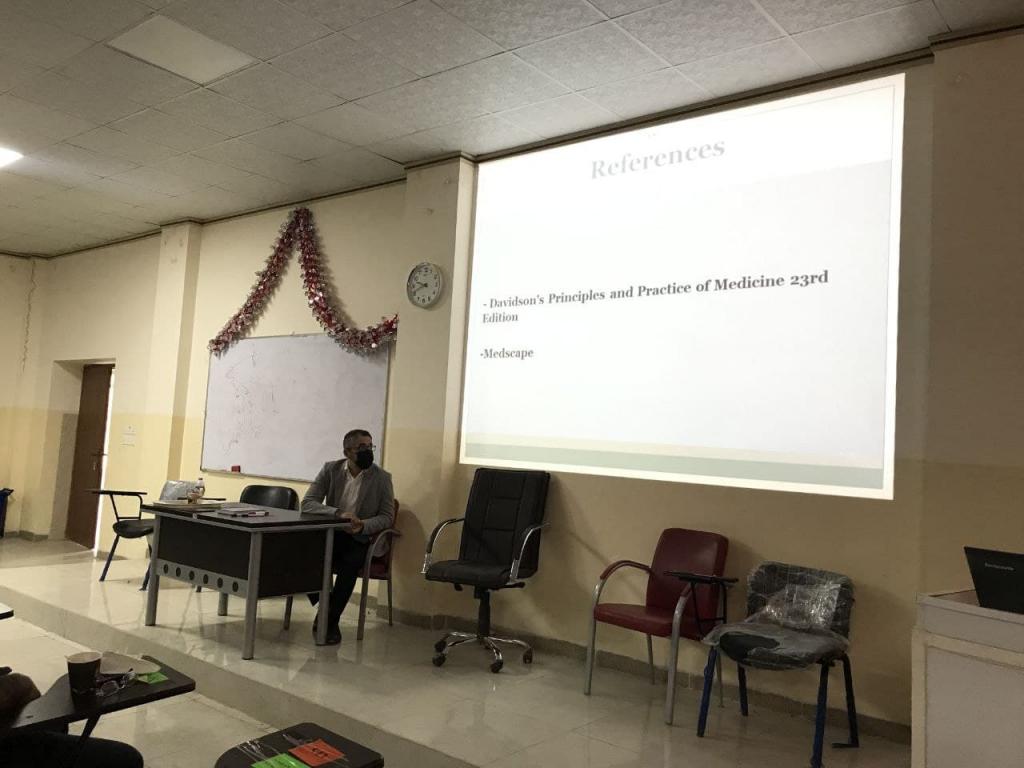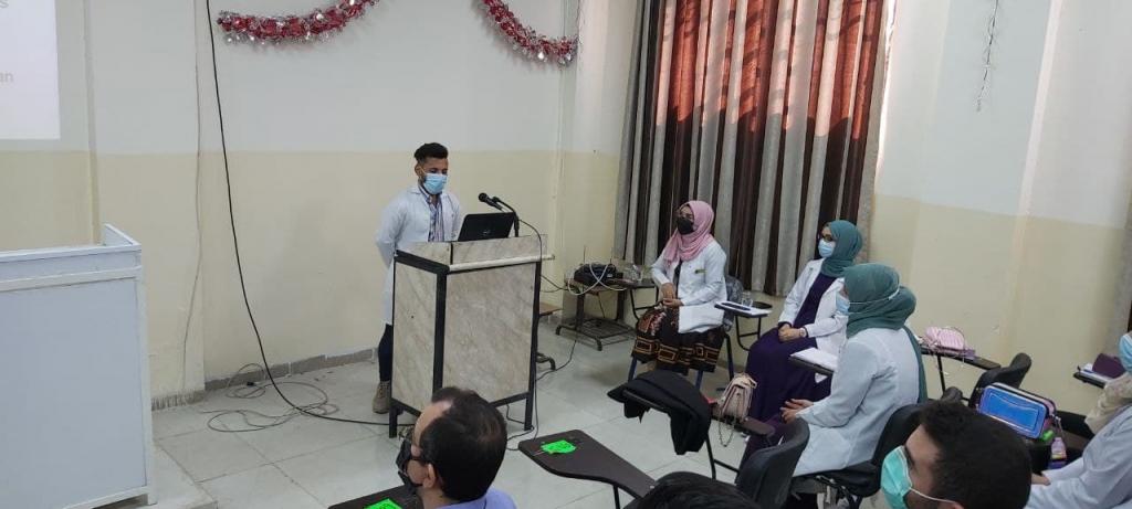 The Department of Medicine resumed holding student seminars for the sixth grade for the new academic year 2021-2022. On Wednesday, 22nd September 2021, the third seminar entitled “Management of Sepsis” was held under the supervision of the Assistant Dr Rami M. Al-Hayali, then followed by the fourth seminar entitled “Respiratory Support” under the supervision of the Lecturer Dr Nawaf Yahya. While on Wednesday, 29th September 2021, the fifth seminar, entitled “Emergency Complications of Cancer” was held under the supervision of the department’s rapporteur, Assistant Prof Dr Alia A. Najm followed by the sixth seminar entitled “Management of Covid 19 Patients” under the supervision of Dr Zuhair A. Al-Yuzbaki. On the other hand, on Wednesday, 6th October 2021, the seventh seminar entitled “Medical Problems in Pregnancy” was held under the supervision of Dr Nassar Ghaleb, then the eighth seminar entitled “Pyrexia of Unknown Origin” was held under the supervision of Dr Salam Farid.