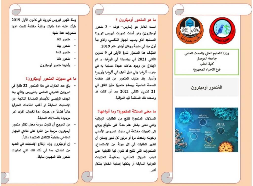 Under the patronage of the President of University of Mosul, Prof Dr Qusay K. Al-Ahmadi, and under the supervision of the Dean of the College of Medicine, Prof Dr Basil Mohammednather Saeed, the Department of Microbiology organized an awareness leaflet about the Omicron on Sunday, 6th February 2022. This activity is of great importance as it contributes to awareness of new or emerging diseases in a manner that enhances the role of the college and the university together to confirm their important position in the service of man and society as a whole.