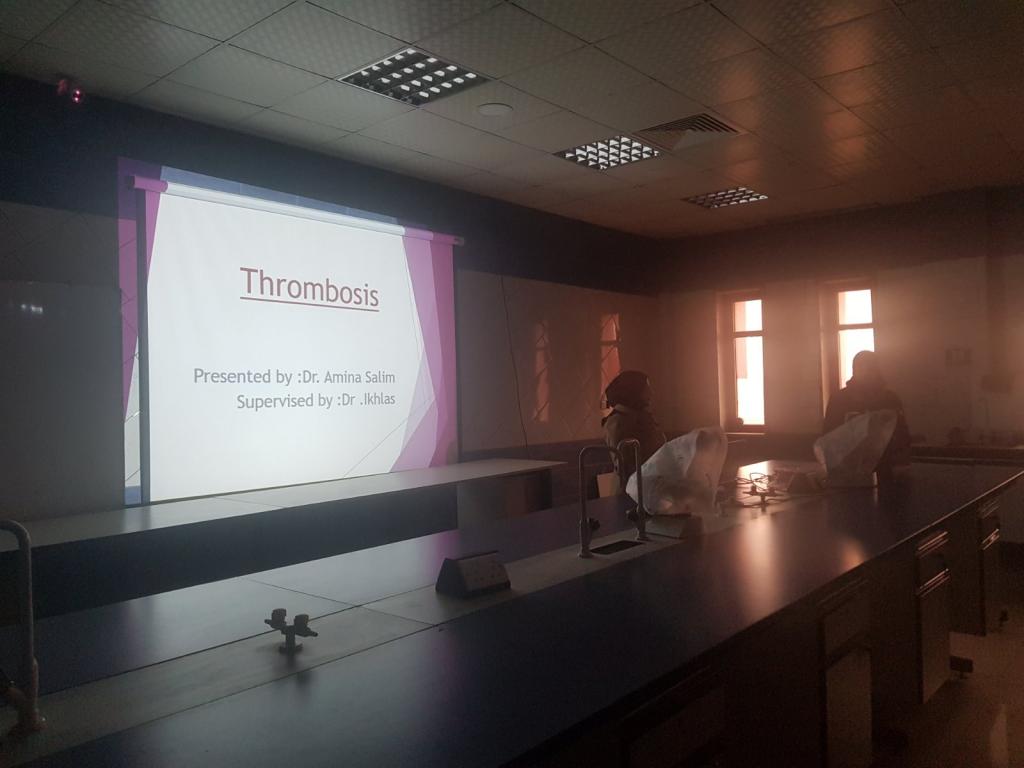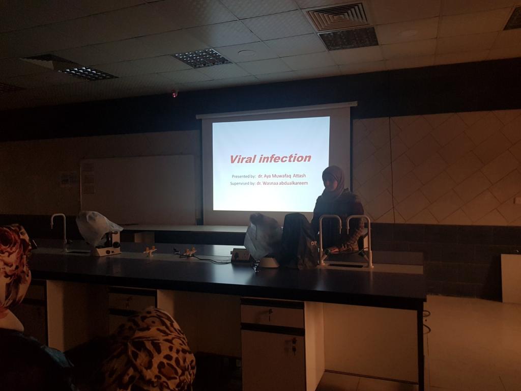 In the presence of the Head of the Department of Pathology, Assistant Prof Dr Nadwa S. al-Ezzo, the department conducted the fifth and sixth seminars for two students from the Iraqi Board, on Monday, 9 December 2019. The student Aya M. Attash presnetd the seminar entitled “Viral Infection” under the supervision of Dr Wasnaa Abdel Karim (Pathologist in al-Khansaa Hospital). After that, the student Amina S. Mohamed presented the seminar entitled “Thrombosis” under the supervision of Assistant Prof Dr Ikhlas A. Ali. The discussions were followed each seminar by the attendees of teaching staff and postgraduates.