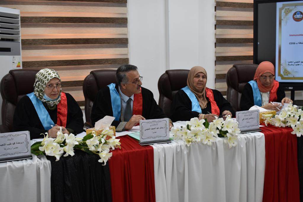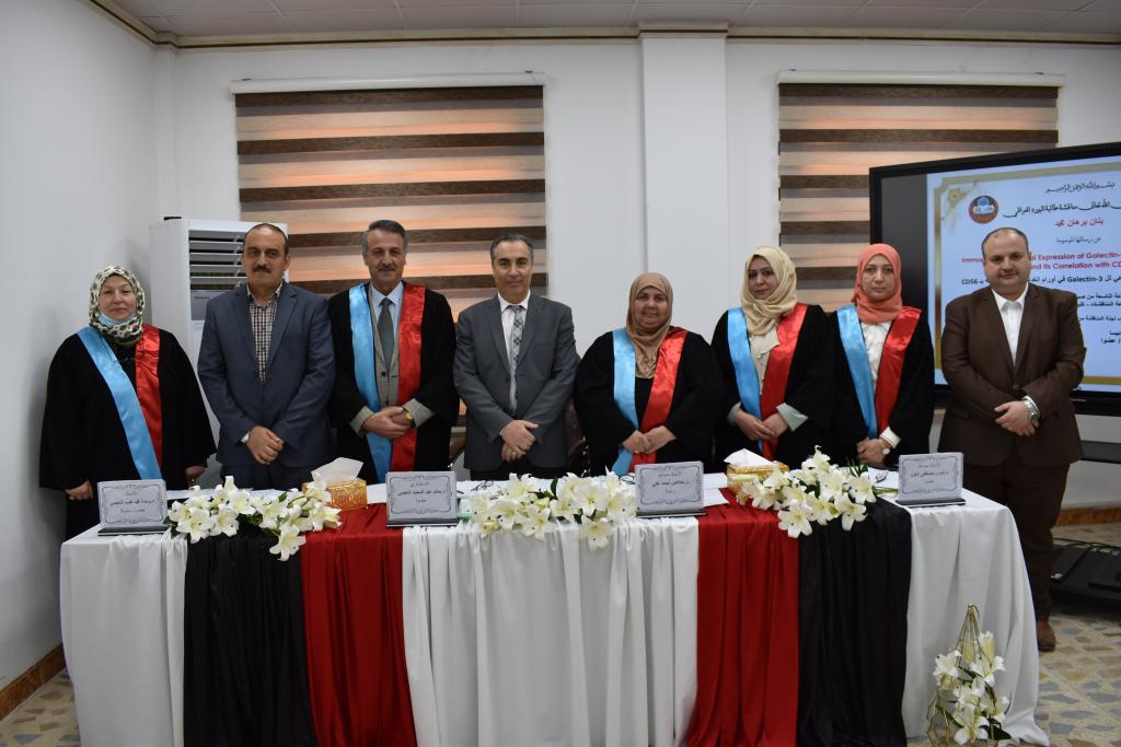 On the morning of Sunday, 10th April 2022, a discussion was held for the student of the Iraqi Board of Pathology Banan B. Muhammad Al-Abadi entitled “Immunohistochemical Expression of Galectin-3 in Thyroid Neoplasms and its correlation with CD56″The discussion committee consisted of:Assistant Prof Dr Ikhlas A. Ali (Chairman)Assistant Prof Dr Nadwa S. El Ezzo (Member)Consultant Dr Hatem A. Al Nuaimi (Member)Prof Dr Wahda M.Tayeb Al-Nuaimi (Member and supervisor)The study concluded with several results, the most important of which are:1) The study showed a significant relationship of Galectin-3 with types of thyroid glands.2) Significant correlation between Galectin-3 and CD563) Galectin-3 can be used in the diagnosis of thyroid cancer especially papillary thyroid cancer.Finally, the student’s research was accepted at the end of the discussion.