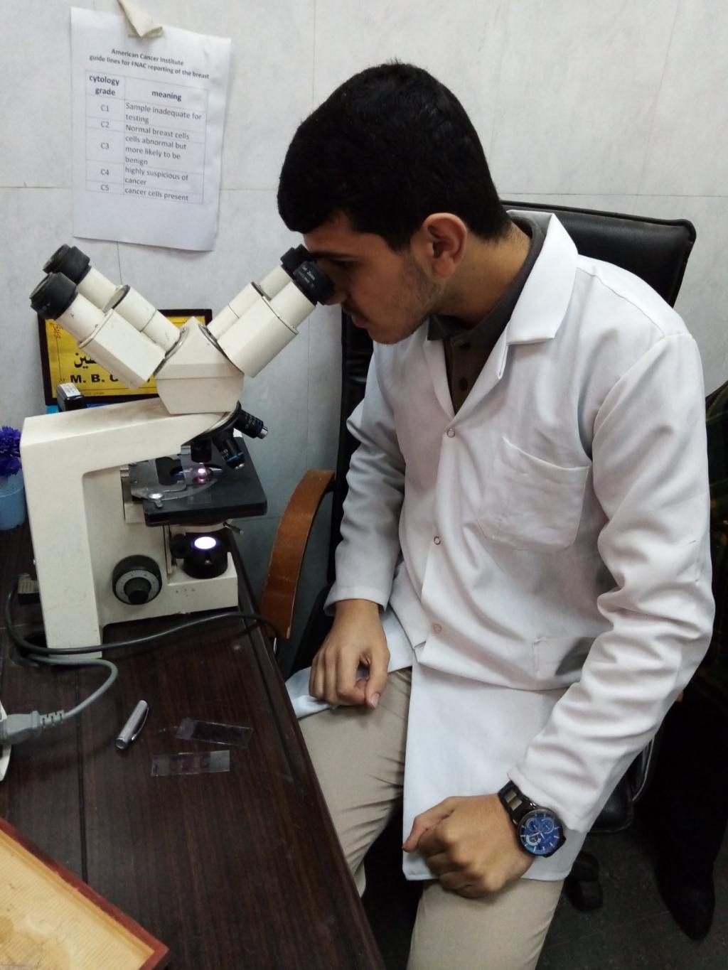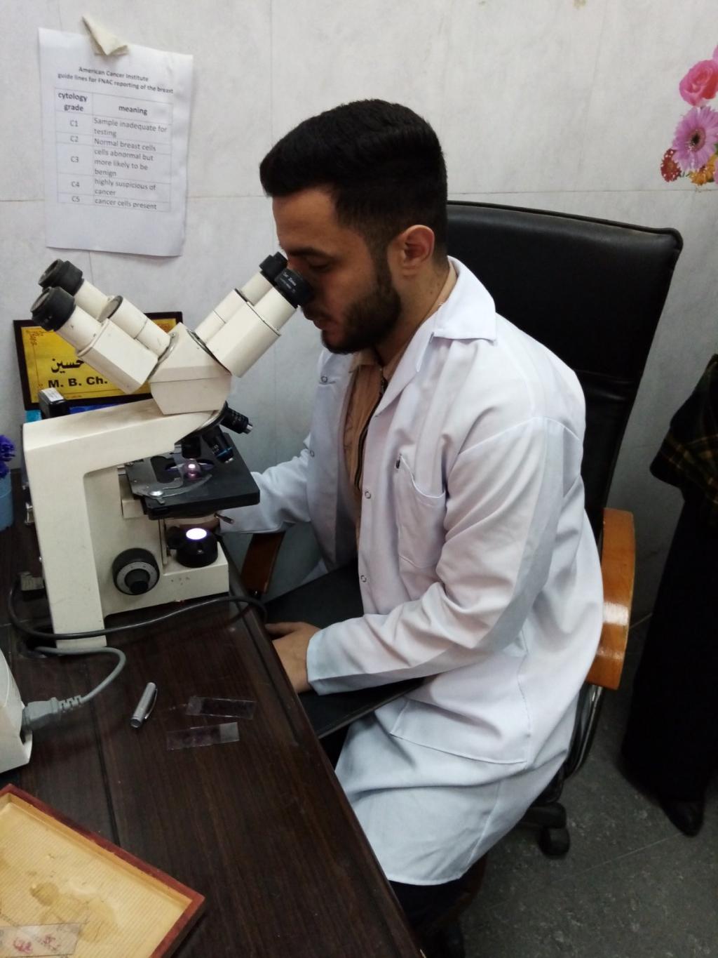 Under the supervision of the Deanship of the College of Medicine, the Department of Pathology organized a field visit in which a number of third-stage students were escorted to al-Khansaa Teaching Hospital on Wednesday, 8 January 2020. The department’s lecturer Dr Khaled W. Abdel-Fattah kindly escorted aforementioned the students to the pathological and cellular tissue laboratory in the hospital.