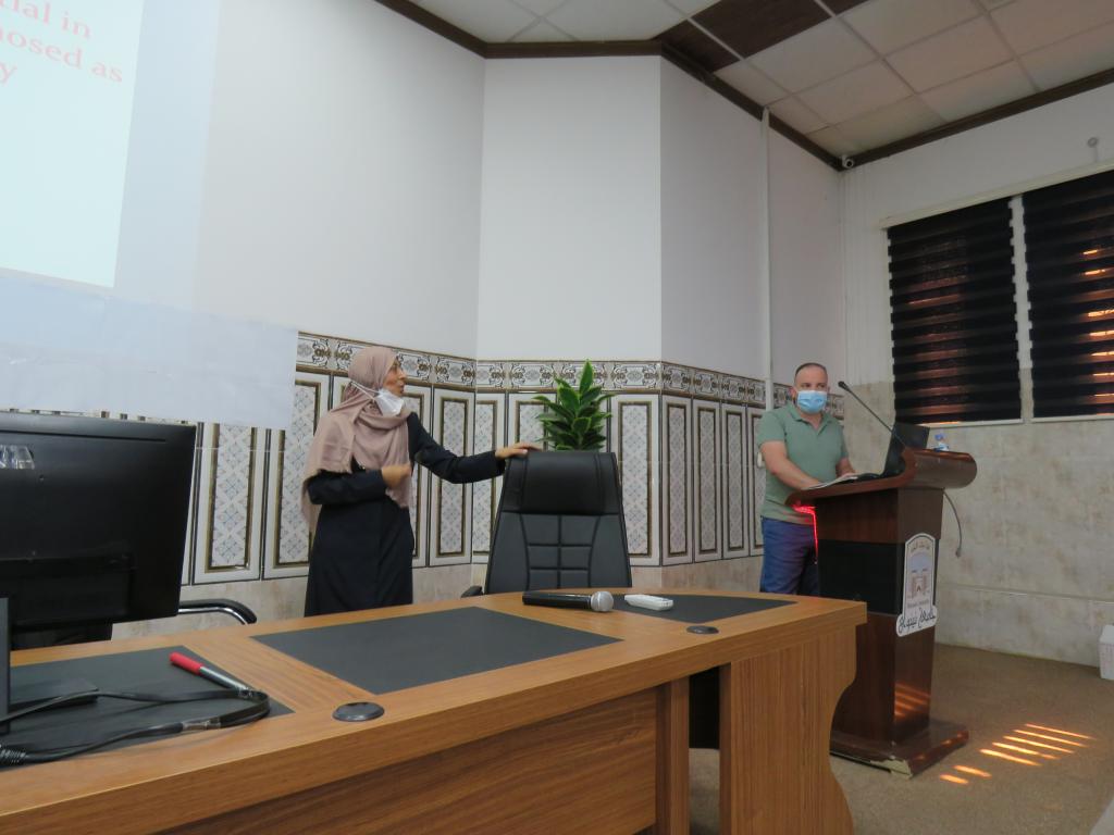 In the presence of the Dean of the College of Medicine, Professor Basil M. Nathir Saeed, and the Scientific Vice-Dean, assistant Prof Dr Humam Gh. Ibrahim, the Department of Medical Physiology held a discussion of the Master’s students ’projects on Sunday, September 19th 2020. The presentation was made in Prof Dr Taher Al-Dabbagh’s hall amid restrictive health procedures. After that, there were extensive interventions and discussions by the attendees about the three projects presented. The presentation was also attended by the Head of the department, assistant Prof Dr Afra M. Al-Amin, and the Head of the Graduate Studies Department, Dr Khaled Walid Turki in addition to the rapporteur and teaching staff of the department and all postgraduate students. In a related context, and after the above presentation, a research project for a master’s student in the Department of Microbiology was presented. The presentation was attended by the head of the department, Lecturer Dr Firas M. Al-Taie as well as the department’s rapporteur and teaching staff and postgraduate students.