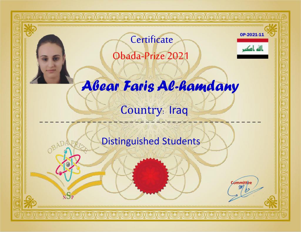 The Medical Student, Abeer Faris Al-Hamdani, Gets the First Place in the International Obadah Award for Innovative Research