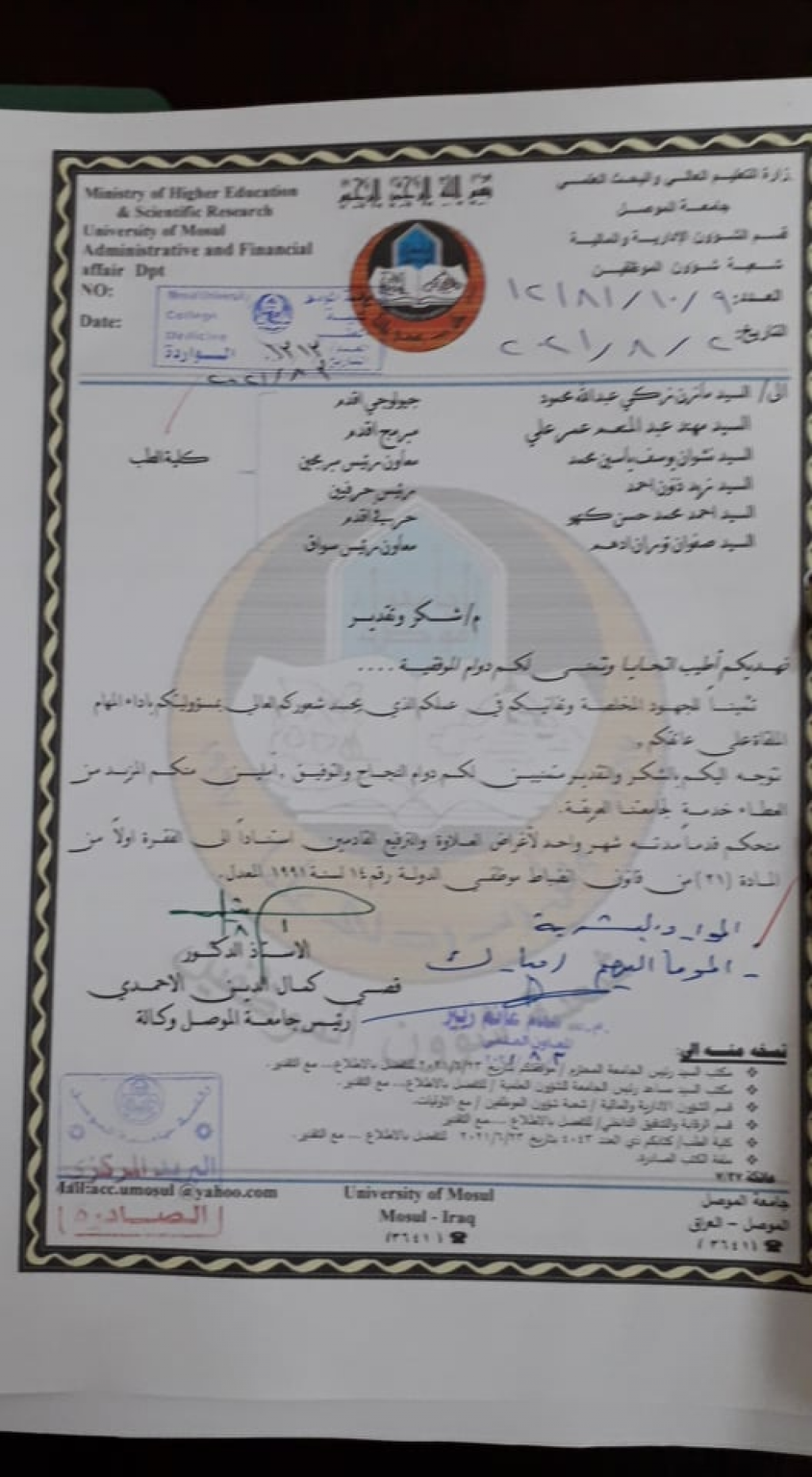 The Presidency of University of Mosul Addresses a Letter of Thanks to Six Members of the College of Medicine