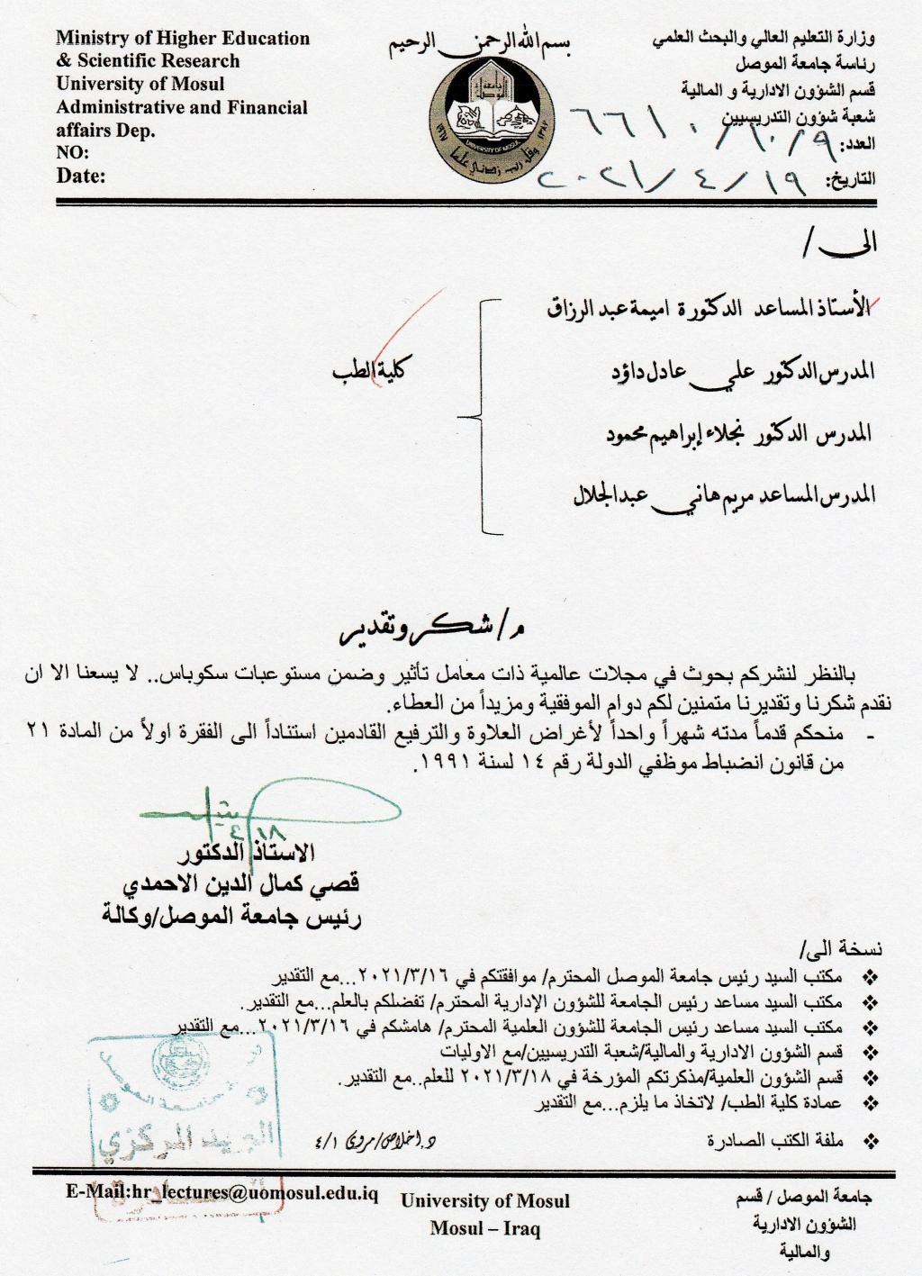 The Presidency of University of Mosul Directs a Thankful Letter to a Number of Teaching Staff of the College of Medicine