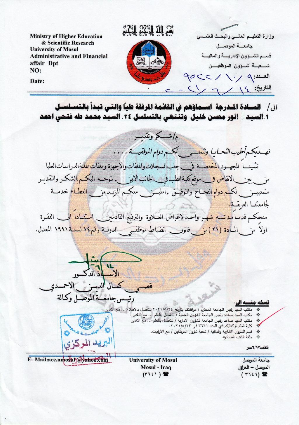 The Presidency of University of Mosul Directs Thankful Letter to Thirty-Two Associates of the College of Medicine