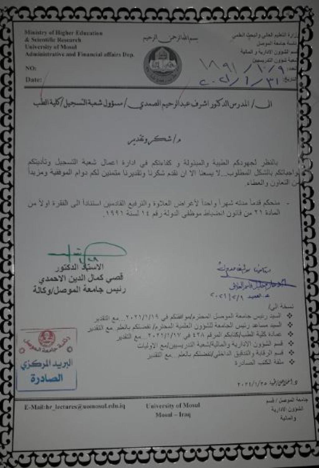 The Responsible and some members of the Registration Division Obtain a Letter of Thanks from the Presidency of University of Mosul