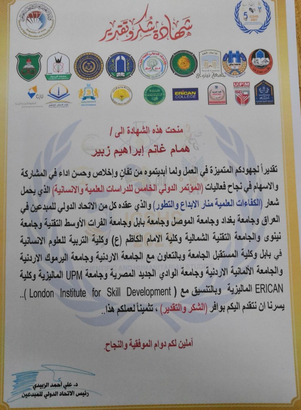 The Scientific Vice-Dean Gets a Thankful Letter from the International Union of Creators in Iraq