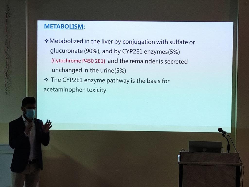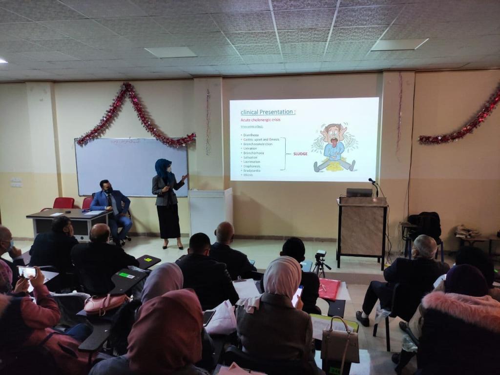 The twenty-fifth seminar entitled “General and Specific Management of Common Poisoning” was presented by the students: Adnan Khalil, Shaima Muhammad, Ghufran Rafi, Ali Hawass, and Uday Abdel Salam and under the supervision of the department’s lecturer Dr Muhammad H. Al-Saati. The seminar dealt with educating students about common cases of poisoning, how to diagnose and treat them with presenting the most important anti-toxins used.