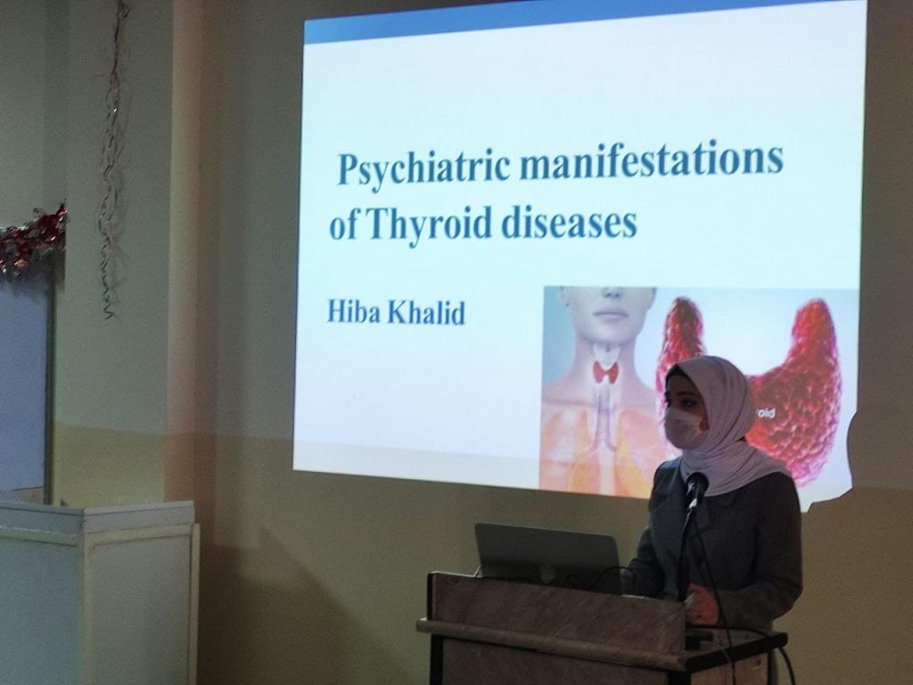 After that, the twenty-sixth seminar entitled “Psychiatric Manifestations of Systemic Illnesses” was presented by students: Firas Muhammad, Muhammad Ayad, Manar Abdul-Rahman, Najm Abed, and Heba Khalid and under the supervision of the department’s lecturer Dr Safia I. Chalabi. The seminar dealt with the psychological symptoms of internal diseases and ways of diagnosing, and dealing with them especially in an intensive care or otherwise.