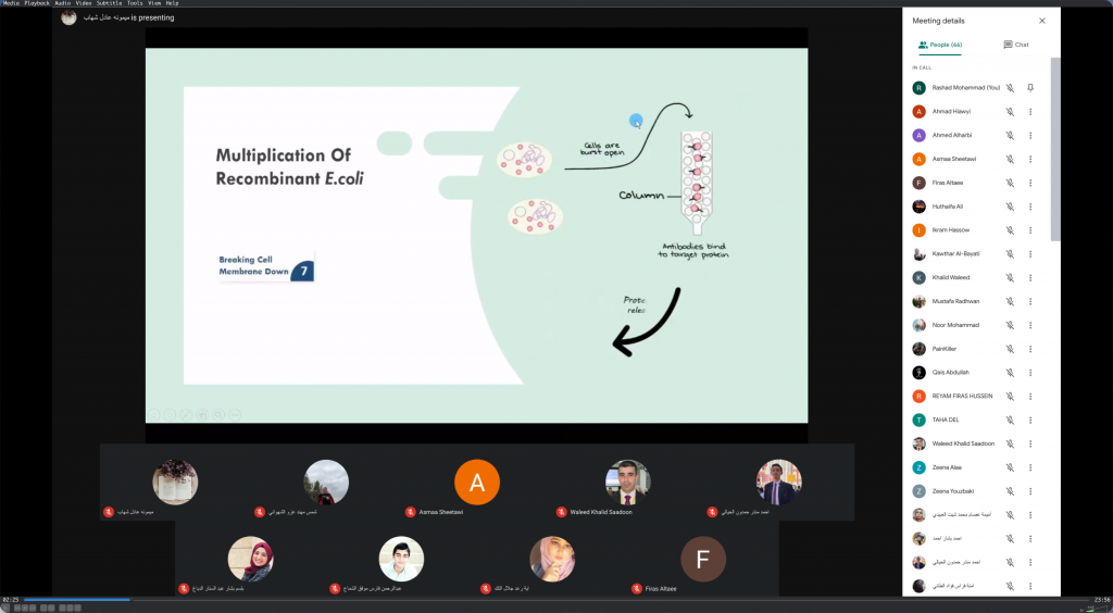 Two virtual students seminars of the Department of Microbiology discussed the topics of antibiotics and genetic engineering techniques on Thursday, 4th March 2021. The students: Saad A. Abdel Qader, Aya R. Jalal, Zeina Duraid, Aseel Abdel Mohsen, Amna Firas, Afrah Abdul Razzaq Muhammad, and Mahmoud Sh. Mahmoud presented the seminar entitled “Antibiotics, How do they work ?” It was shed light on the antibiotics in terms of their origin and classifications. It also discussed its working methods, and the methods it uses to eliminate various germs.