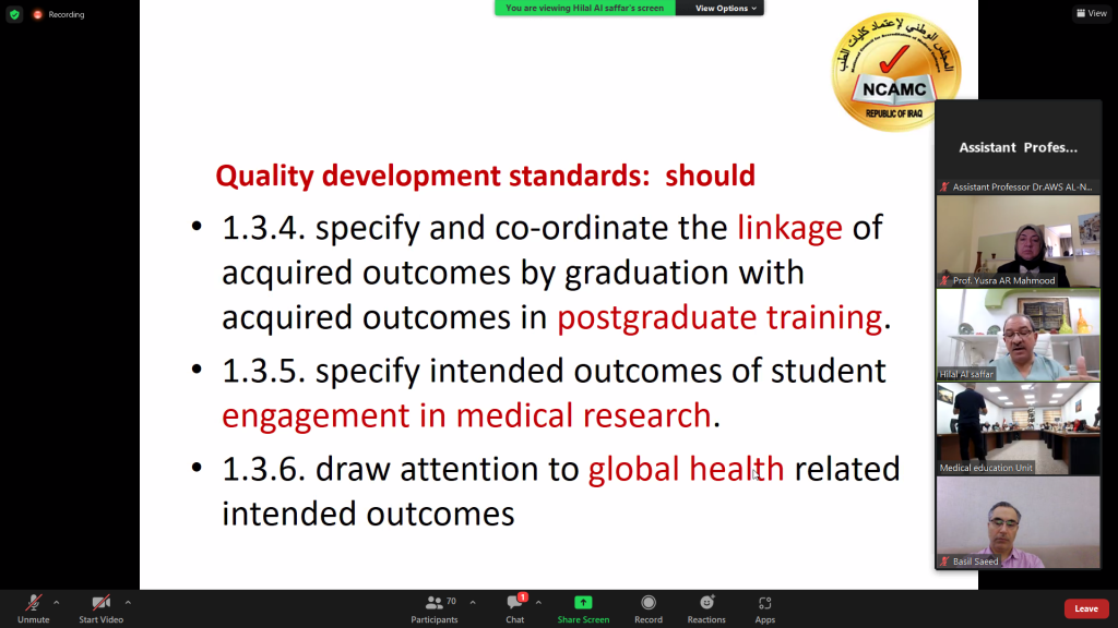Online WorkshopContinuation the schedule of the National Council for Accreditation of Medical Colleges workshop program in cooperation with the deanship of the College of Medicine, and the coordination of the Quality Assurance and Performance Evaluation Division in the college.The members of the National Council met with the Dean of the College of Medicine, Prof Dr Basil Mohammednathir Saeed, the Head of the Quality Division, Lecturer Dr Ahmed A. Al-Harbi, and all members of the items in the college virtually in a special session today, Sunday 25/9/2022.