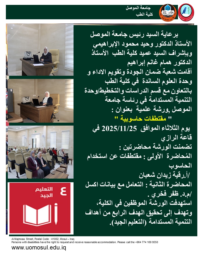 Under the patronage of the President of the University of Mosul, Prof. Dr. Waheed Mahmoud Al-Abrhimi, and the supervision of the Dean of the College of Medicine, Prof. Dr. Humam Ghanim Ibraahim, the Quality Assurance and Performance Evaluation Division and the Supportive Sciences Unit at the College of Medicine, in collaboration with the Studies and Planning Department-Sustainable Development Unit at the University of Mosul, organized a scientific workshop titled: *”Computer Excerpts”* on Tuesday, November 25, 2025, in the Al-Razi Hall, College of Medicine.