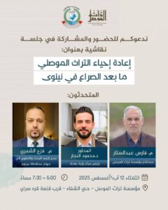 Prof. Dr. Amer Abdullah Al-Jumaili, a lecturer at the Mosul Studies Center, held a discussion session entitled “Reviving Mosul Heritage Post-Conflict in Nineveh” in cooperation with the Nineveh Governorate Diwan, Research and Development Department, on Tuesday 8/12/2025 at 6:00 PM in the hall of the Mosul Heritage Foundation (Beit Al-Rahim). Al-Jumaili emphasized in a proposal he submitted to the envoy of the Governor of Nineveh, Engineer Fazaa Al-Shammari, Director of the Research and Development Department at the Nineveh Governorate Diwan, the importance of documenting the origins of artistic and architectural elements, styles, historical, archaeological and heritage methods of religious, service, defensive and residential buildings in the process of rehabilitating archaeological and heritage sites in the post-conflict phase, in order to preserve the spirit and fabric of the monument, place and its identity, without neglecting the intangible heritage through the reconstruction of folk heritage museums inside Mosul and in the Nineveh Plain areas that were also exposed to destruction during periods of conflict. He suggested creating an audio library that documents the Mosul dialect and heritage and reviving some Extinct professions and crafts, some of which are on the verge of extinction, contribute to the achievement of the Sustainable Development Goals, particularly Goal 4: Quality education through the integration of heritage into curricula and educational activities to enhance identity and cultural awareness. Goal 8: Decent work and economic growth through the revitalization of cultural tourism and handicrafts, as well as Goal 11 of the Sustainable Development Goals: Sustainable cities and communities. This includes protecting cultural and natural heritage and ensuring its sustainability for future generations, while strengthening cultural identity and the local economy through tourism and heritage.
