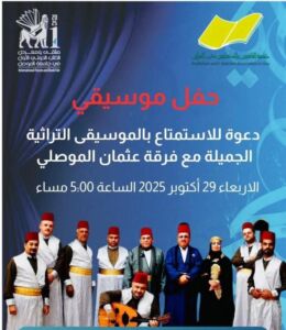 In accordance with the directives of the University of Mosul, represented by its President, Professor Dr. Waheed Mahmoud Al-Ibrahimi, to participate in the scientific and cultural activities of the First International Book Fair and Forum at the University of Mosul, and as part of the fourth day’s events of the fair, the Director of the Mosul Studies Center, Dr. Muhammad Nizar Al-Dabbagh, attended the concert of the Othman Al-Mawsili Ensemble and listened to selections of traditional songs. The concert took place on Wednesday, October 29th, at 5:00 PM on the grounds of the book fair, opposite the Student Center, and was attended by a large audience in appreciation and recognition of this distinguished Mosul figure.