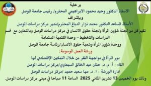 The Women’s Affairs Committee and the Human Rights Committee at the Mosul Studies Center, in cooperation with the Studies and Planning Department – ​​Sustainable Development Unit, the Women’s Affairs Unit, and the Human Rights Division/Presidency of the University of Mosul, and on the occasion of the International Day for the Eradication of Poverty, are holding a workshop entitled: