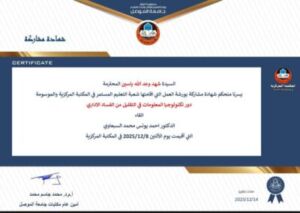 As part of the efforts of the Mosul Studies Center, represented by its Director, Dr. Mohammed Nizar Al-Dabbagh, and in cooperation with the Studies and Planning Department – Sustainable Development Unit/University of Mosul, to encourage center staff and involve them in work-related training courses, Ms. Shahd Waadallah Yassin, the librarian at the Mosul Studies Center, received a certificate of participation for her attendance and participation in the workshop held by the Central Library – University of Mosul – Continuing Education Division, entitled “The Role of Information Technology in Reducing Administrative Corruption,” on Monday, December 8, 2025.