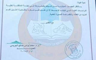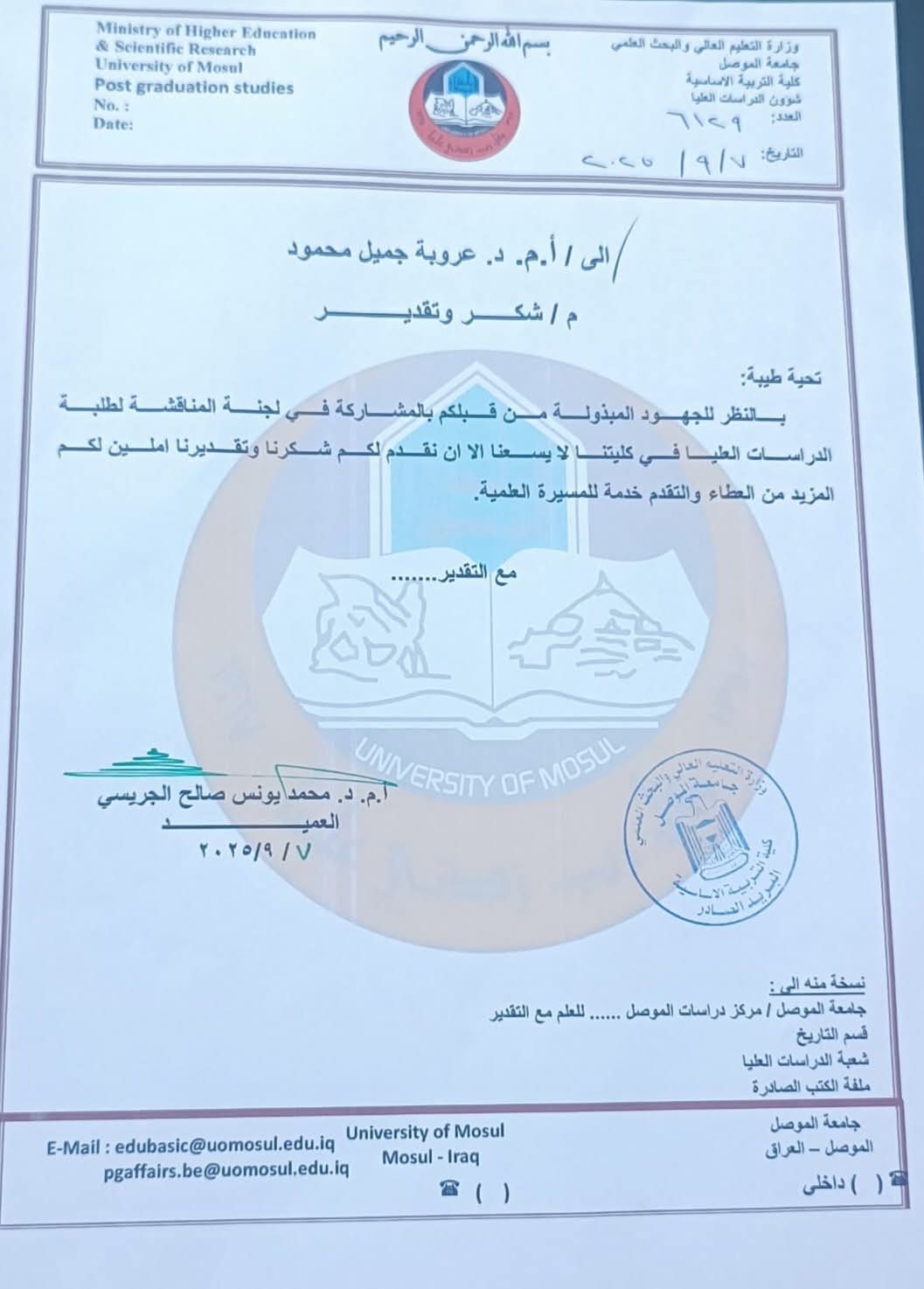 Acknowledgment ................... Assistant Professor Dr. Aruba Jamil Mahmoud, a lecturer at the Mosul Studies Center, received a letter of thanks and appreciation from the Deanship of the College of Basic Education for her efforts in [Read More]
