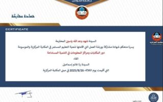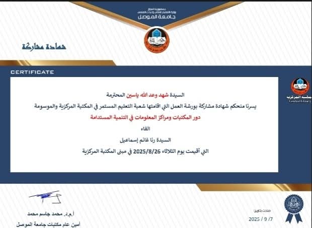 Certificate of Participation .......... Ms. Shahd Waadallah Yassin, librarian at the Mosul Studies Center, received a certificate of participation for her participation in the workshop entitled: The Role of Libraries and Information Centers in Sustainable [Read More]