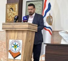 A lecturer from the Mosul Studies Center participates in a memorial service for the late Benjamin Haddad.