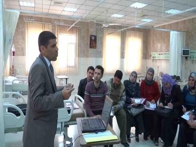 Within the first aid course program that held by the College of Nursing / University of Mosul, Assist. Lect. Mohammed Saleh Awad presented a lecture about how to aid and relief the wounds. The lecture included the definition of wounds and their types and how to aid a person with all kinds of wounds, as well as the distinction between the internal and external wounds. The lecture also applied practically on manikins in the college’s laboratories.