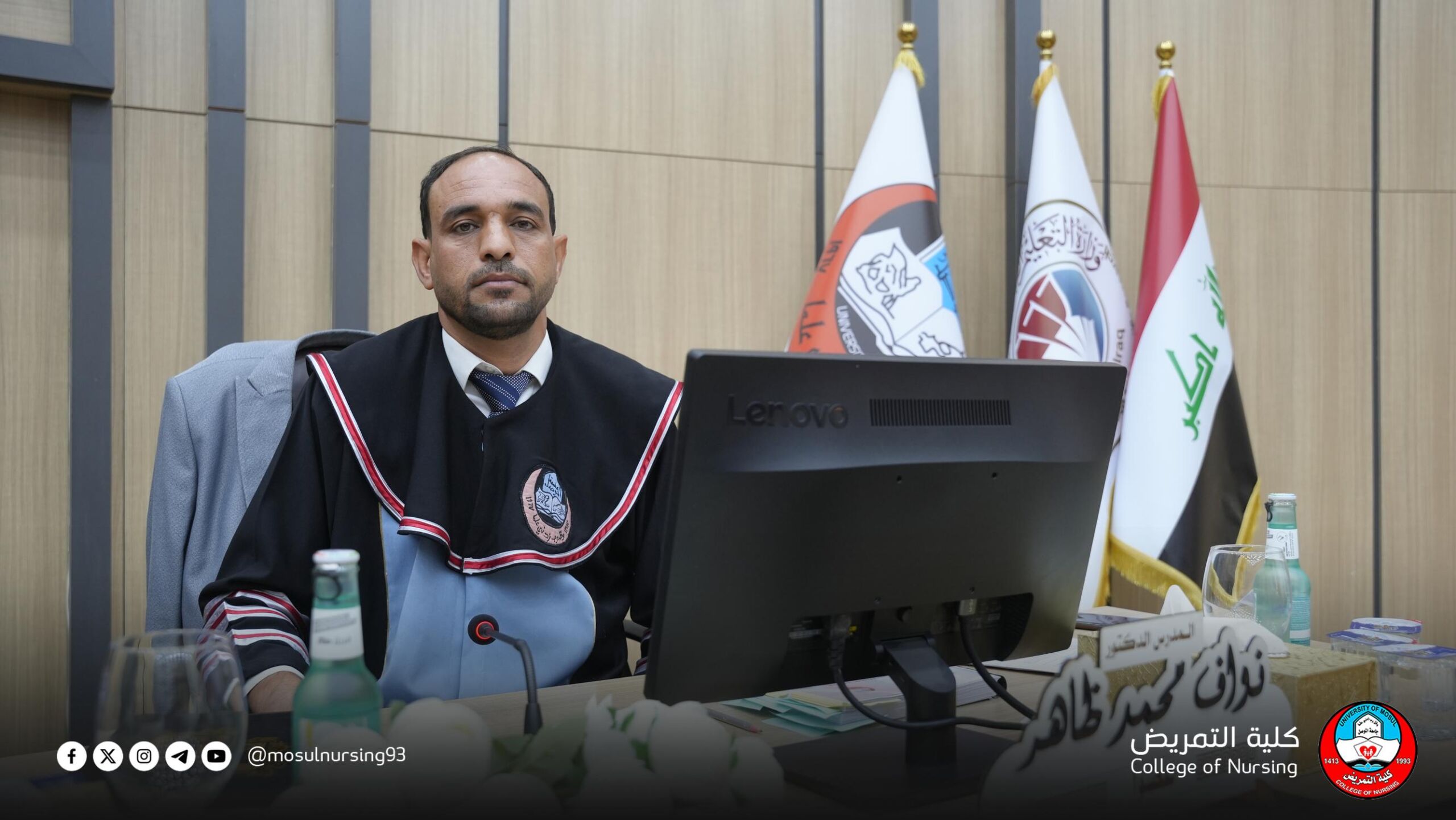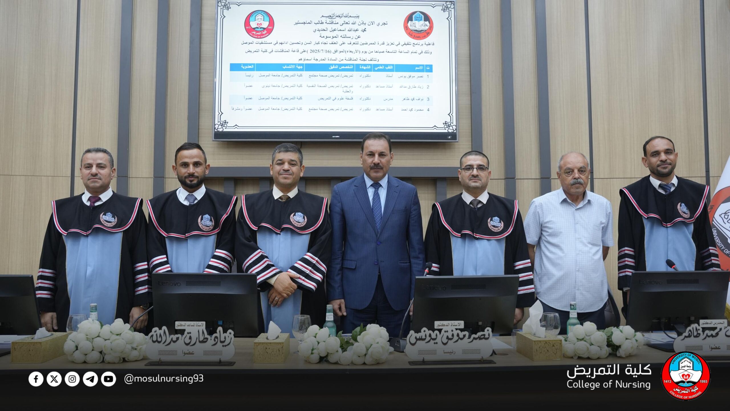 Under the patronage and presence of Assistant Professor Dr.Tahsein Muhsin Husseinn, Dean of the College of Nursing at the University of Mosul, the master’s thesis defense of student Mohammed Abdullah Ismail was held on the morning of Wednesday, July 16, 2025, in the discussion hall of the College of Nursing.