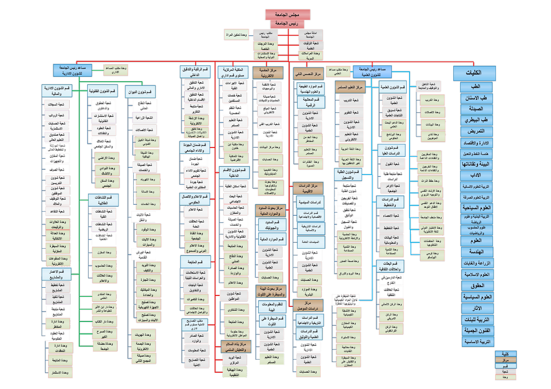 The organizational structure of the University of Mosul represents a comprehensive administrative and academic framework designed to ensure operational efficiency and coordination among the university’s various components. It consists of the University Council and the Presidency, supported by Vice Presidents for Administrative and Academic Affairs, in addition to a network of specialized administrative departments such as Finance, Planning, Audit, Reconstruction, Legal Affairs, and Student Affairs.
