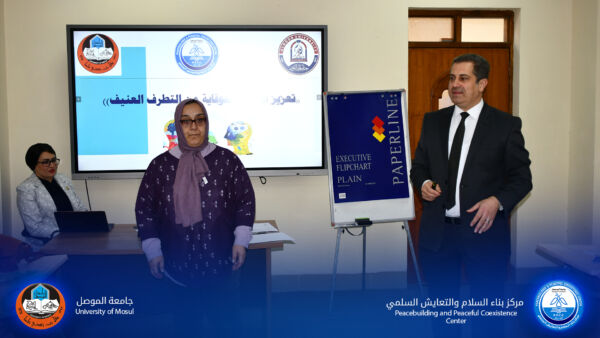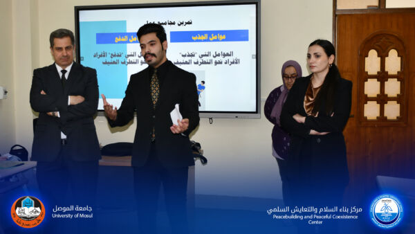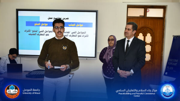 Today, Sunday 24/11/2024, the training for the We Are the Peace project, implemented by the Center for Peacebuilding and Peaceful Coexistence in cooperation with Al-Noor University, began. More than forty male and female students from both universities participated in the first day of training, which was dedicated to the topic of enhancing resilience to prevent violent extremism. The training was managed by Assistant Professor Dr. Fathi Muhammad Al-   Hayani, Director of the Center, and Professor Dr. Waad Ibrahim Khalil, Head of the Capacity Building Department, with the assistance of Professor Dr. Asmaa Saud Idham and Assistant Lecturer Mustafa Ahmed Fouad. There was a lot of interaction among the students on the first day of the three-day training for the first group of project participants, which consists of 100 male and female students.