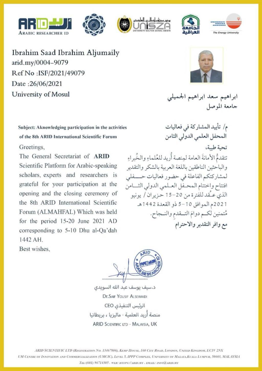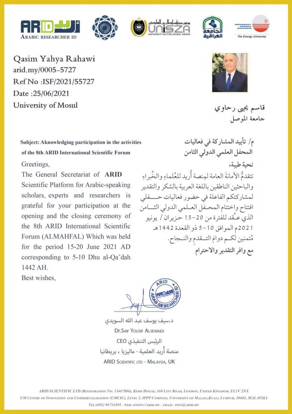 The general secretariat of ARID Scientific Platform for Arabic-speaking scholars, experts and researches is grateful for your participation at the opening and the closing ceremony of the 8th ARID international scientific forum (ALMAHFAL) which was held for the period 15-20 June 2021 AD corresponding to 5-10 Dhu alQa’dahWhere Prof. Dr. Ibrahim Saad Ibrahim Al-Jumaili/Department of Petroleum and Refining Engineering, Assistant Professor Dr. Qassem Yahya Rahawi/Department of Engineering, and Dr. Mohammed Hussin Ahmed/Department of Petroleum and Refining Engineering received participate certificate in the activities of the scientific forum, wishing them continued progress and success in the scientific fields.