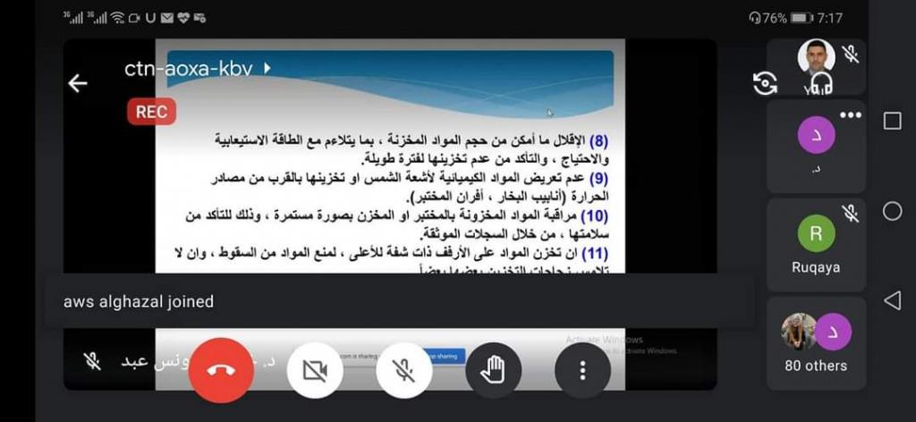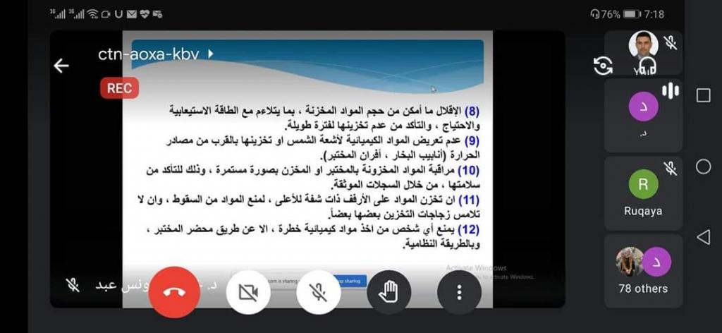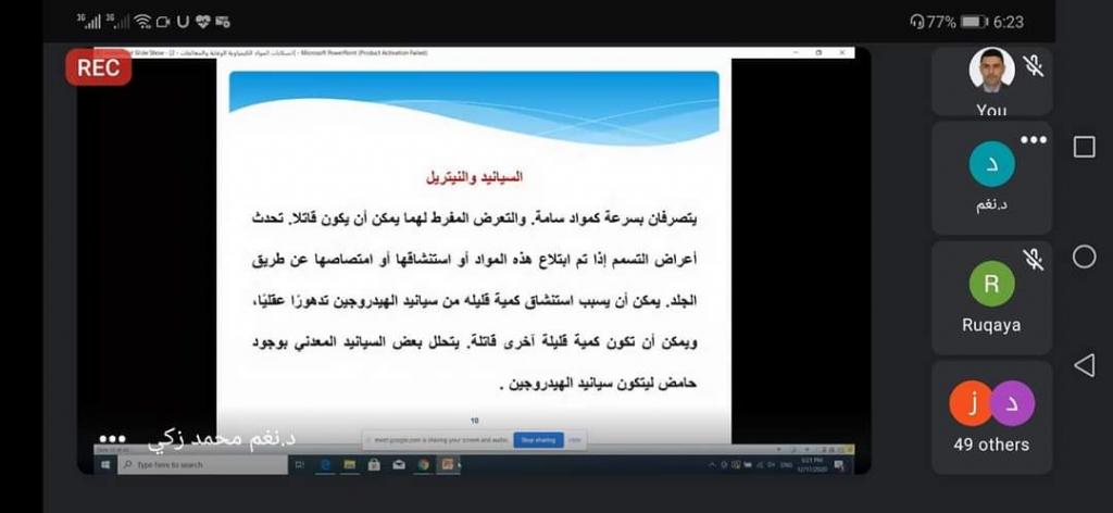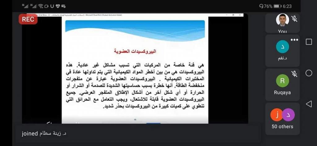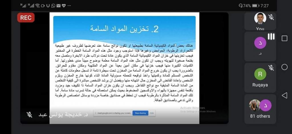 The closing ceremony of the chemical and biological laboratory safety courseThe department of Pharmacognosy has completed the activities of the final day of the chemical and biological laboratory safety course, which was held under the generous patronage of the President of the University of Mosul, Prof. Dr. Qusay Kamal Al-Din Al-Ahmadi, and the support of the dean of the college of pharmacy Assistant prof. Dr. Zina Abdulmunim AbdulmajeedThe course started with a lecture by Dr. Nagham Muhammad Zaki on how to deal with chemical spills and ways to manage such hazards, followed by the last lecture given by Dr. Khadija Younus Abed, which dealt with the correct storage standards for chemicals. This has ended by opening of discussions and questions, and then an evaluation test for the participants in the course followed by reading the recommendations and the outcomes of the course by Dr. Jahan Abdel-Wahab, head of the Pharmacognosy department.