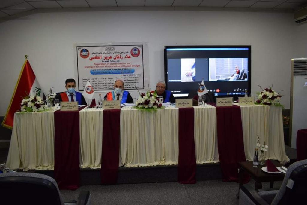 Under the patronage of the dean of the College of Pharmacy, the Associated Prof. Dr. Zena A. Al-Thanoon, a Viva voce for the Thesis submitted by the postgraduate student, Ala’a R. Al-Taei was run on Thursday, Jan the 27th. 2022.The thesis entitled” Preparation, in-vitro evaluation and pharmaco-dynamic study of minoxidil topical emulgel”The study involved preparing Eight formulae of minoxidil loaded nanoemulsion and conducting different investigational studies such as measurement of pH, electrical conductivity, percent of light transmittance, drug content and entrapment efficiency, droplet size, polydispersity, zeta potential, and thermodynamic stability studies to determine the optimum formulae.The results of this study have lead to the conclusion that nanoemulgel is considered an advanced technique for enhancing delivery with prolonged contact time, enhanced permeation, and consequent enhanced pharmaco-dynamic effect of minoxidil.