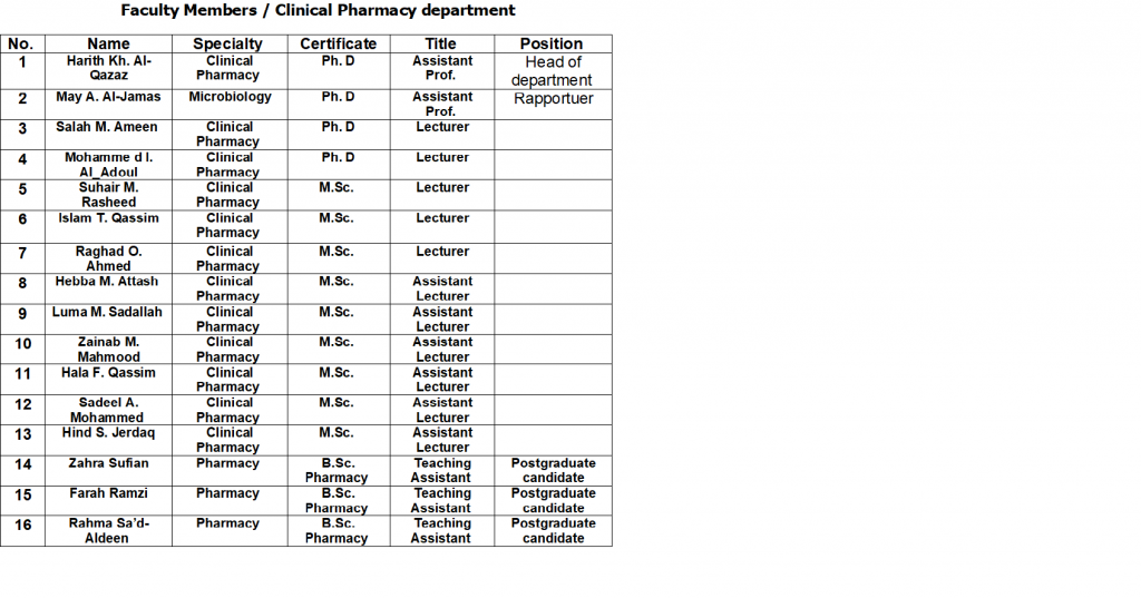Providing scientific expertise in pharmaceutical and medical skills by maintaining full quality for obtaining the scientific accreditation of the clinical pharmacy curricula in line with pharmaceutical needs. Furthermore, contributes to the provision of continuing pharmacy education programs and services for the unceasing development of pharmaceutical society.
