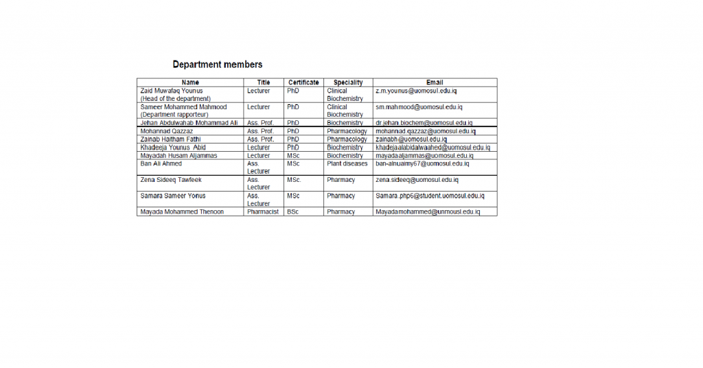 The Department of Pharmacognosy and Medicinal Plants has been integral to the scientific departments of the college of pharmacy at the University of Mosul. The disciplines of Pharmacognosy and medicinal plants span the basic mechanisms of extraction, separation, purification and classification of therapeutically active substances from natural sources, evaluation of their therapeutic efficacy, metabolism, and distribution, along with studies of the toxic or harmful effects of these chemicals/drugs on biological systems. Consequently, the Department of Pharmacognosy and Medicinal Plants integrates diverse basic and scientific investigations on common research interests, providing unique capabilities to advance the discovery and development of new therapies. With a vibrant Pharmacognosy and medicinal plants Department, our strategic objectives are to provide a dynamic and diverse academic environment that fosters innovative, ground-breaking research in Drug discovery based on natural extracts and promotes strong evidence-based teaching and scientific training for our students.