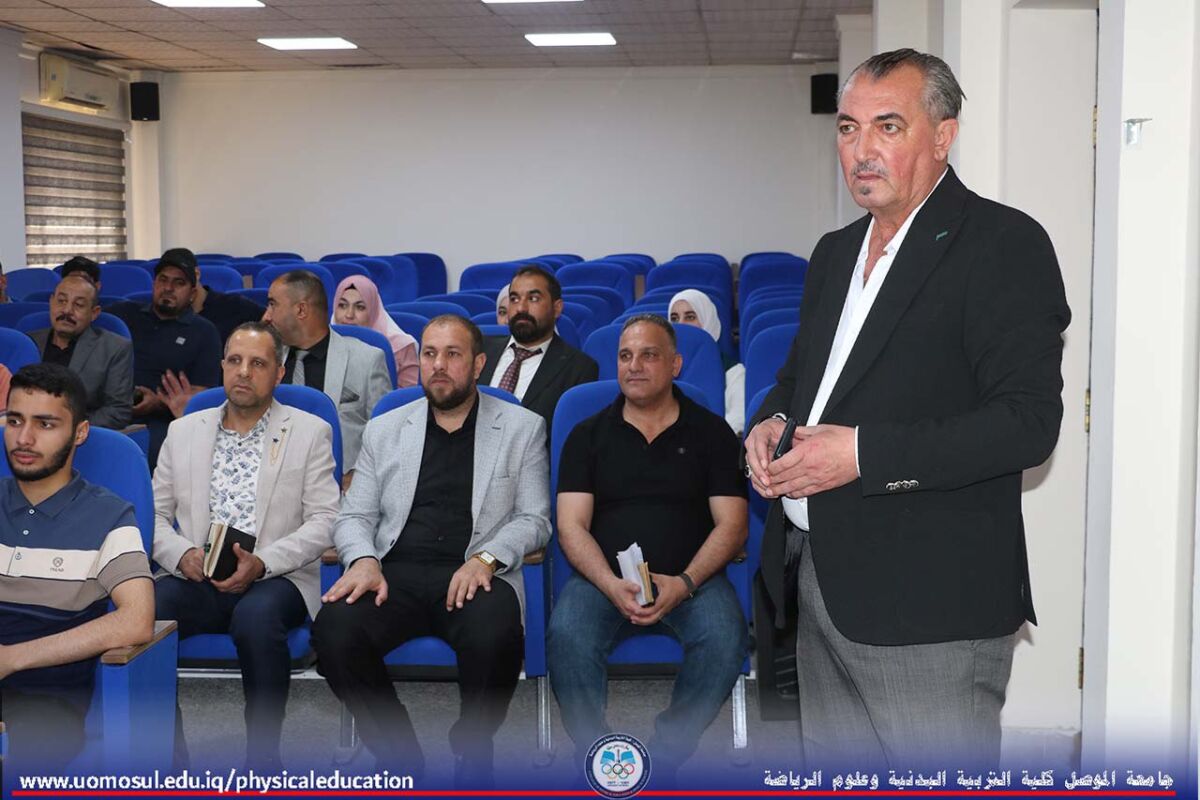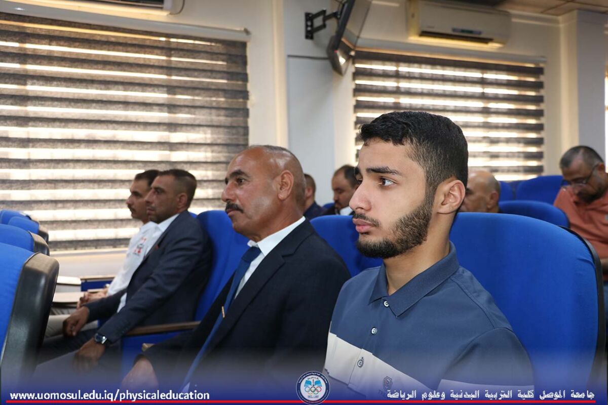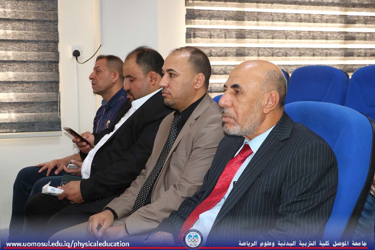 Professor Dr. Nibras Younis Mohammed, Dean of the College, and a number of faculty members attended the discussion. The thesis submitted by student Abdul Karim Habou Mohammed Al-Habou addressed the cognitive behavioral intervention program, which is considered one of the pioneering psychological programs in the field of sports psychology. It combines behavioral and cognitive aspects and is based on the idea that behaviors can be modified or changed by altering thoughts and false beliefs. This integration helps athletes understand how their thoughts influence their behavior and performance, which contributes to improving their psychological compatibility and adaptation to the sporting environment in which they live, thus improving their performance.
