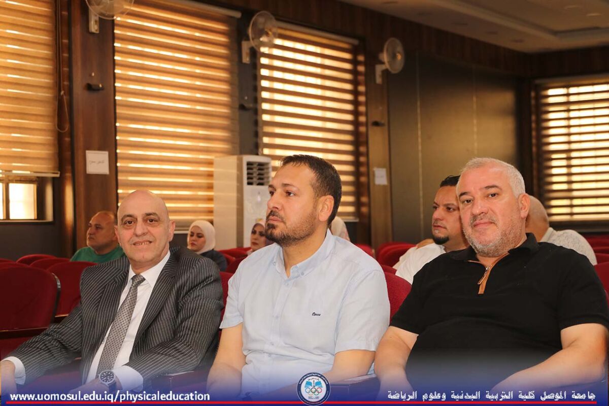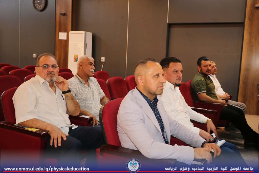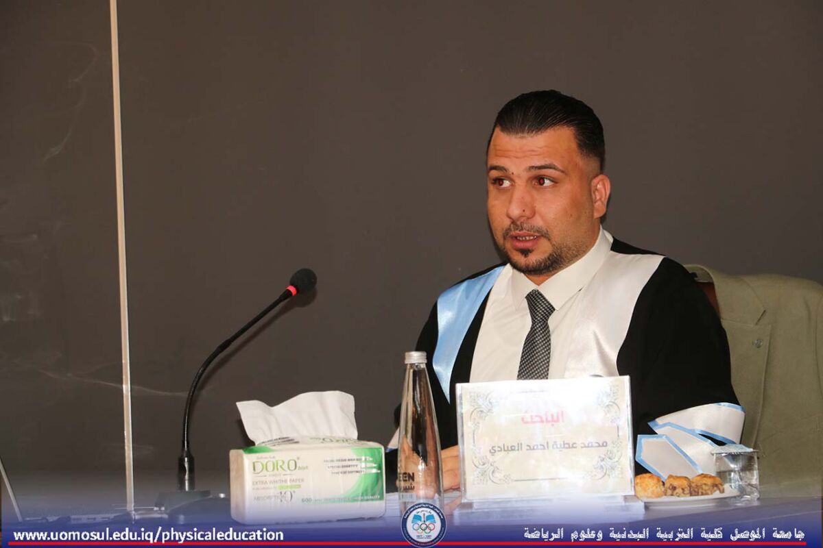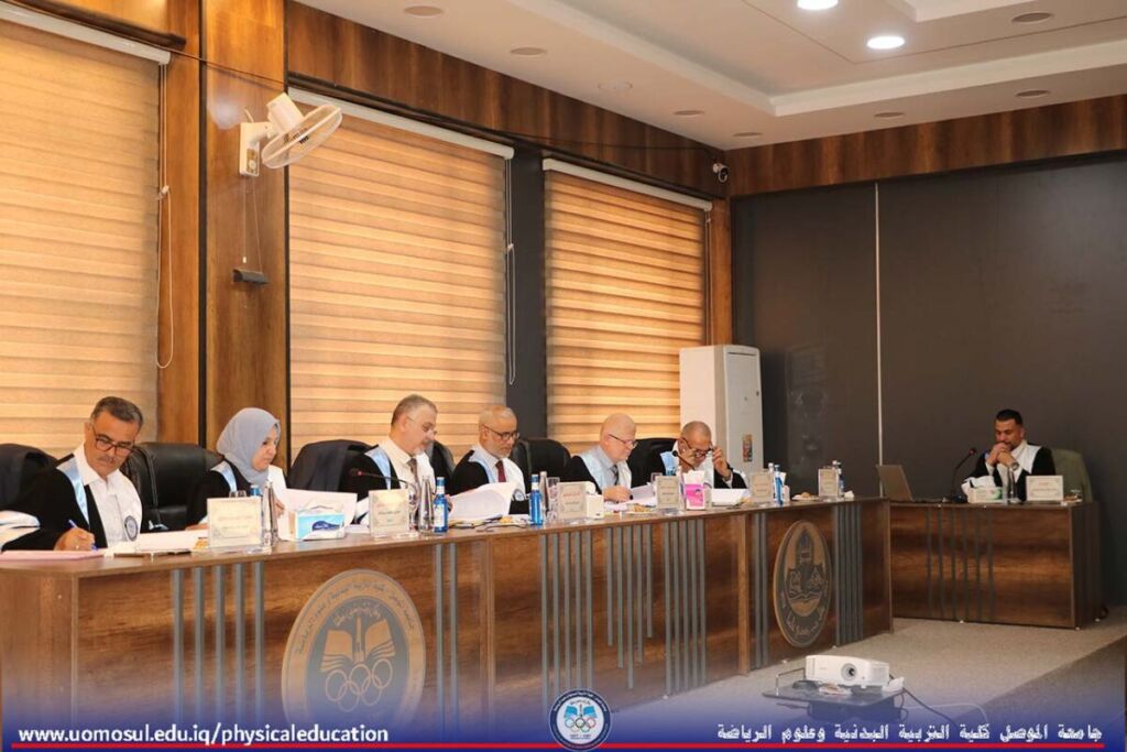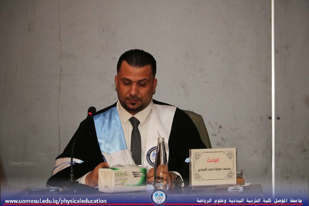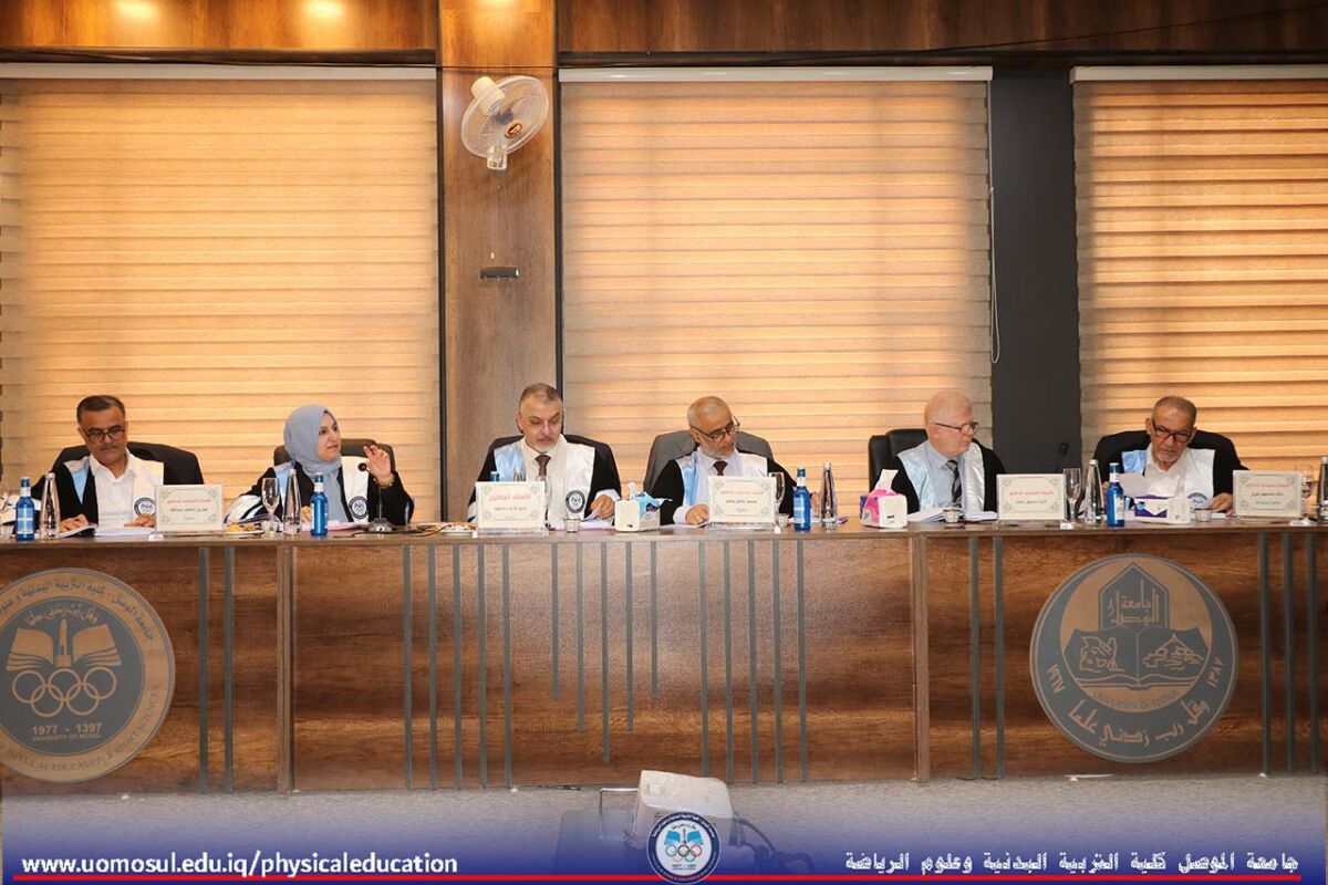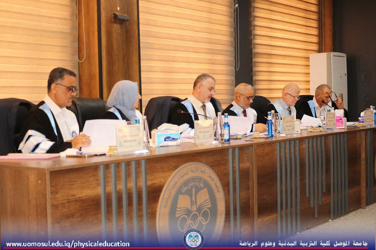 The College of Physical Education and Sports Sciences at the University of Mosul hosted a doctoral thesis discussion on “Organizational Normalization and Its Role in Job Cynicism among the Staff of Youth and Sports Directorates in Iraq” on July 2, 2025. Part of the discussion was attended by Professor Dr. Nibras Younis Mohammed Al Murad, Dean of the College; Professor Dr. Omar Samir Dhanoon, Head of the Individual Games Department; Professor Dr. Mahmoud Hamdoon, Head of the Team Games Department; Professor Dr. Ali Hussein Muhammad, Head of the Sports Sciences Department; and a number of college instructors. The thesis, presented by doctoral student Muhammad Attia Ahmad Khalil, specializing in administration and organization, addressed organizational normalization, job cynicism, and the Youth and Sports Directorates in Iraq. It aimed to design a questionnaire on organizational normalization in the Youth and Sports Directorates in Iraq, develop a scale for job cynicism among the staff of the Youth and Sports Directorates, and identify the level of organizational normalization within the Youth and Sports Directorates. It also aimed to identify the level of job cynicism and the relationship and role of organizational normalization within the Youth and Sports Directorates in job cynicism among their staff. The discussion committee was headed by Professor Dr. Adi Ghanem Mohammed Al-Kawaz, and the membership of Assistant Professor Dr. Hadeel Dahi Abdullah, Assistant Professor Dr. Mohammed Dhaker Salem, Assistant Professor Dr. Honar Saber Mahmoud, and Assistant Professor Dr. Thabet Ihsan Hamid, under the supervision and membership of Assistant Professor Khaled Mahmood Aziz Al-Abbadi.