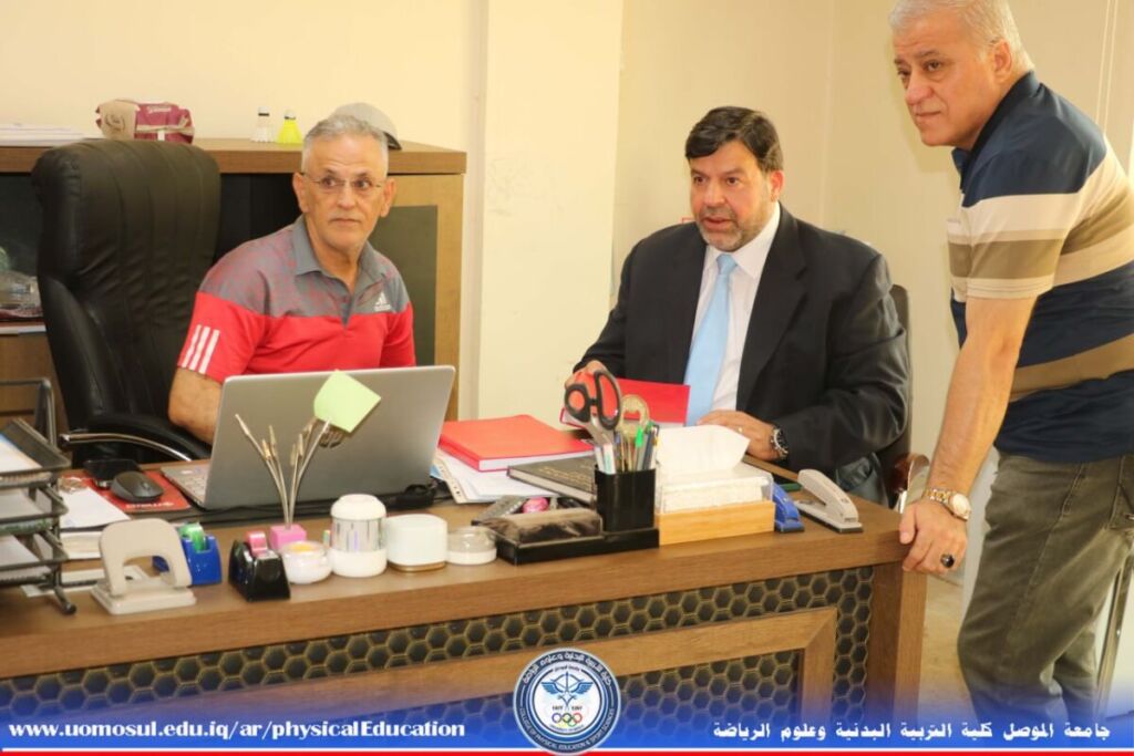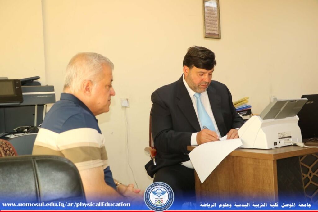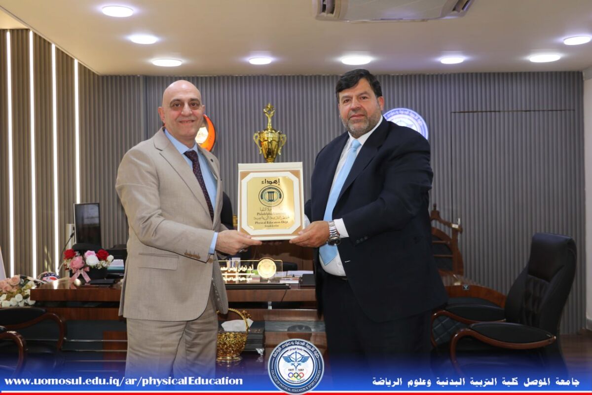 As part of the approved external examiner guide of the Scientific Supervision and Evaluation Authority/Department of Quality Assurance and Academic Accreditation – Ministry of Higher Education and Scientific Research, and within the framework of scientific cooperation between Iraqi, Arab, and international universities, the College of Physical Education and Sports Sciences, represented by its Dean, Professor Dr. Nibras Younis Mohammed Al-Murad, received (on Sunday, August 17, 2025), a visiting professor in the external examiner program, Professor Dr. Abdul Basit Mubarak Al-Sharman from Hashemite University – Hashemite Kingdom of Jordan.